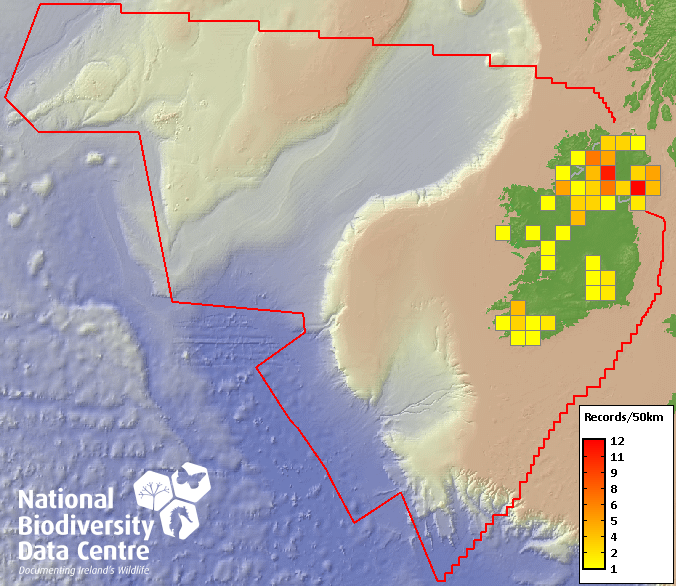 Distribution of the number of records recorded within each 10km grid square (ITM).Marine Map - 50km