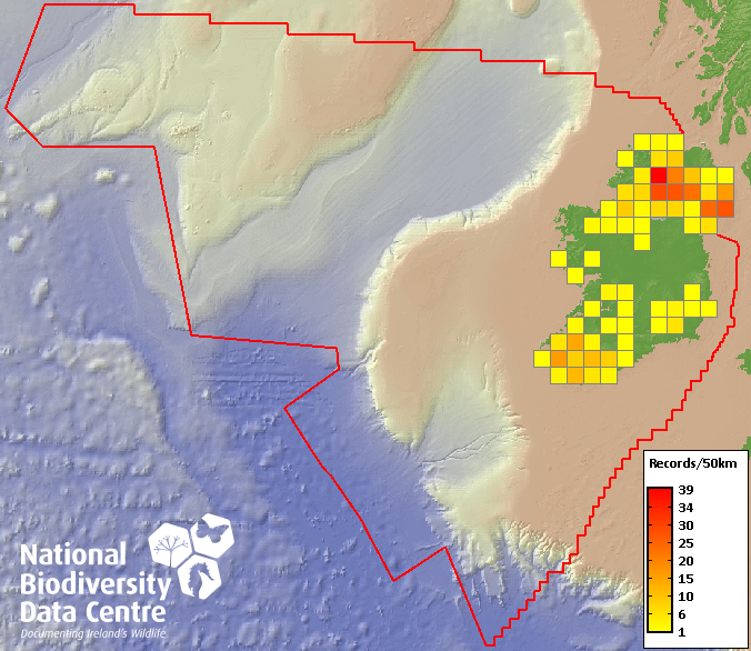 Distribution of the number of records recorded within each 10km grid square (ITM).Marine Map - 50km
