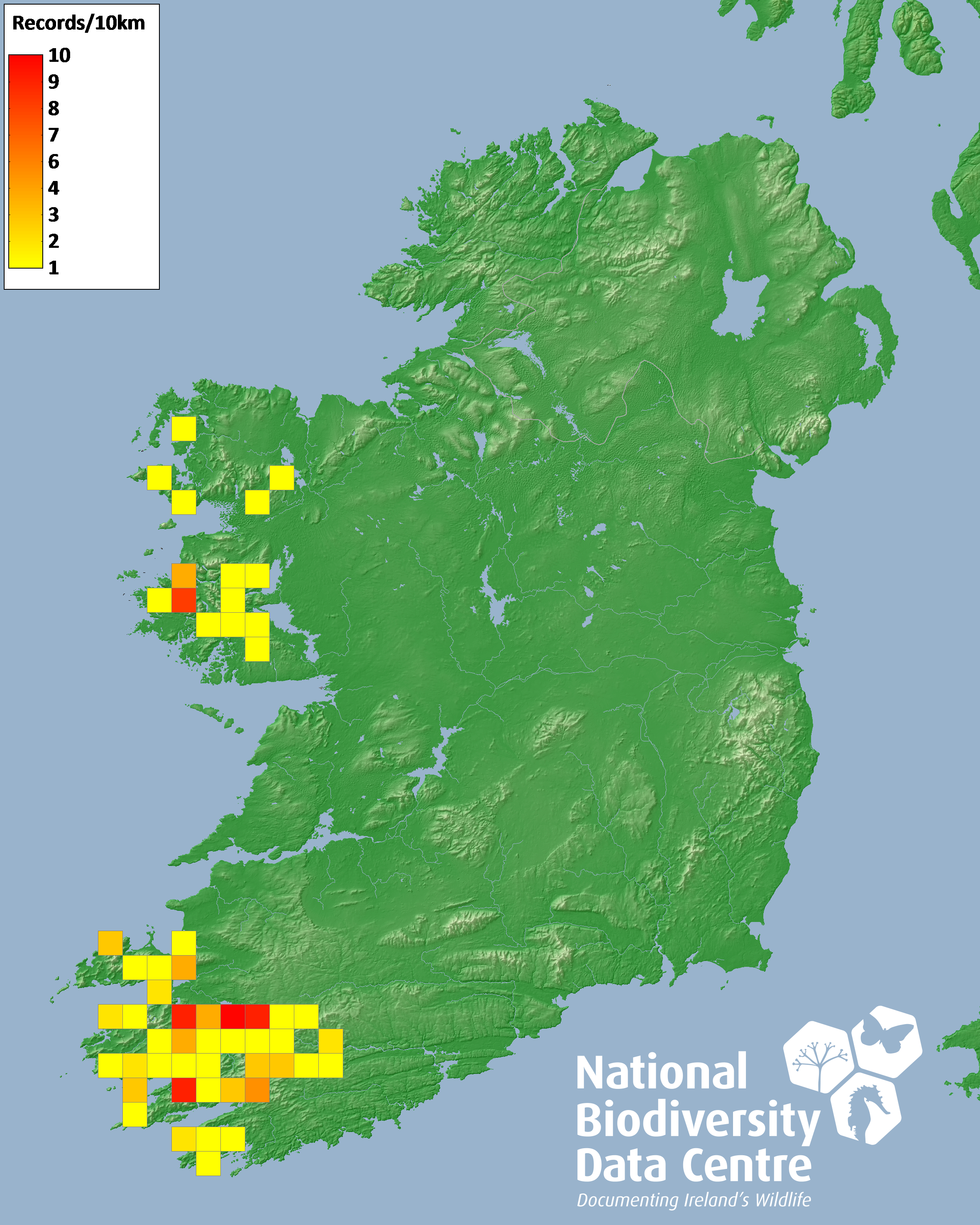 Distribution of the number of records recorded within each 10km grid square (ITM).Marine Map - 50km