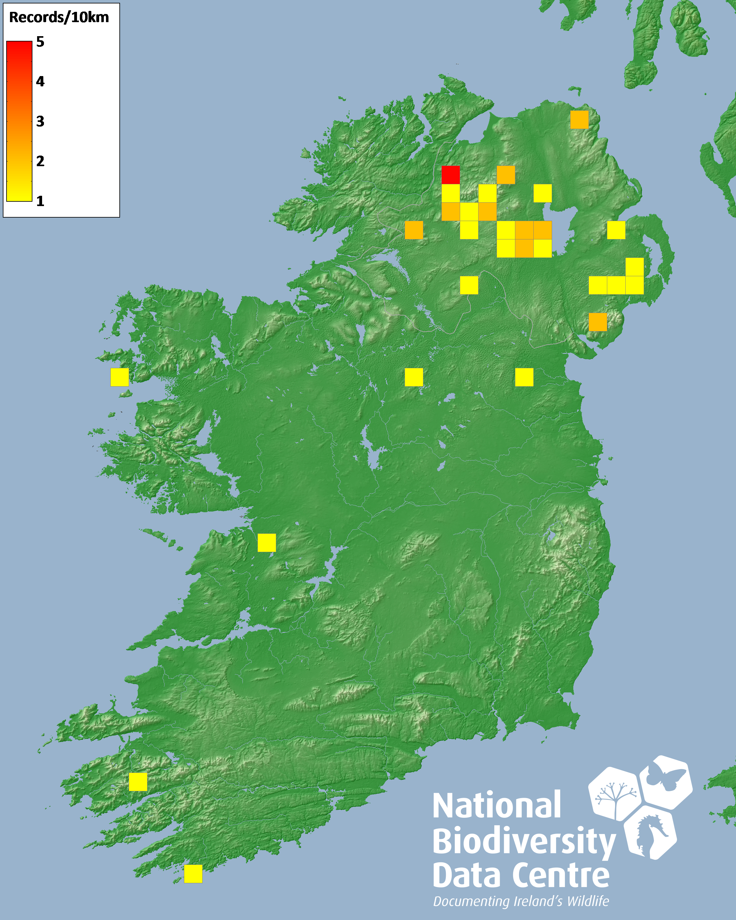 Distribution of the number of records recorded within each 10km grid square (ITM).Marine Map - 50km