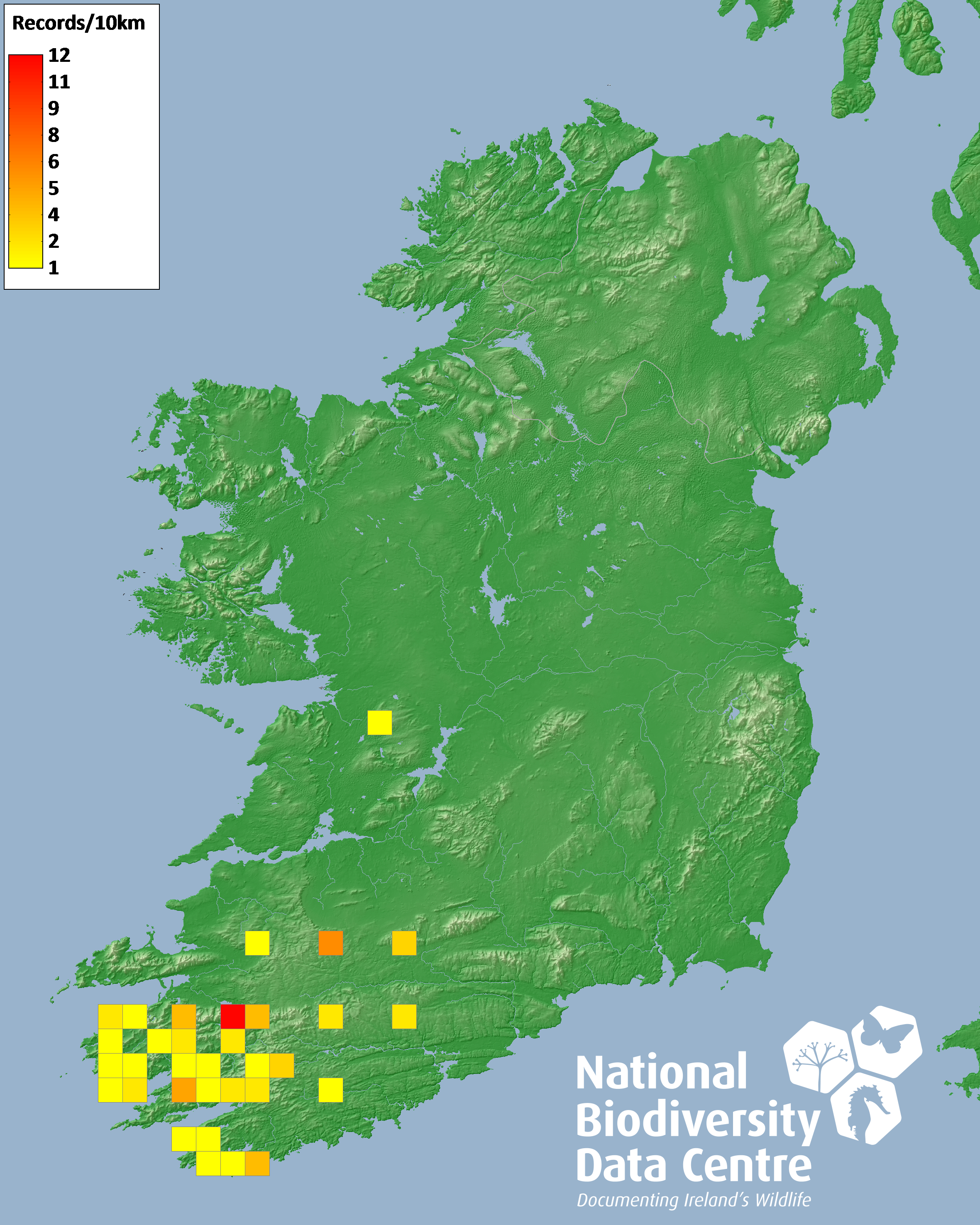 Distribution of the number of records recorded within each 10km grid square (ITM).Marine Map - 50km