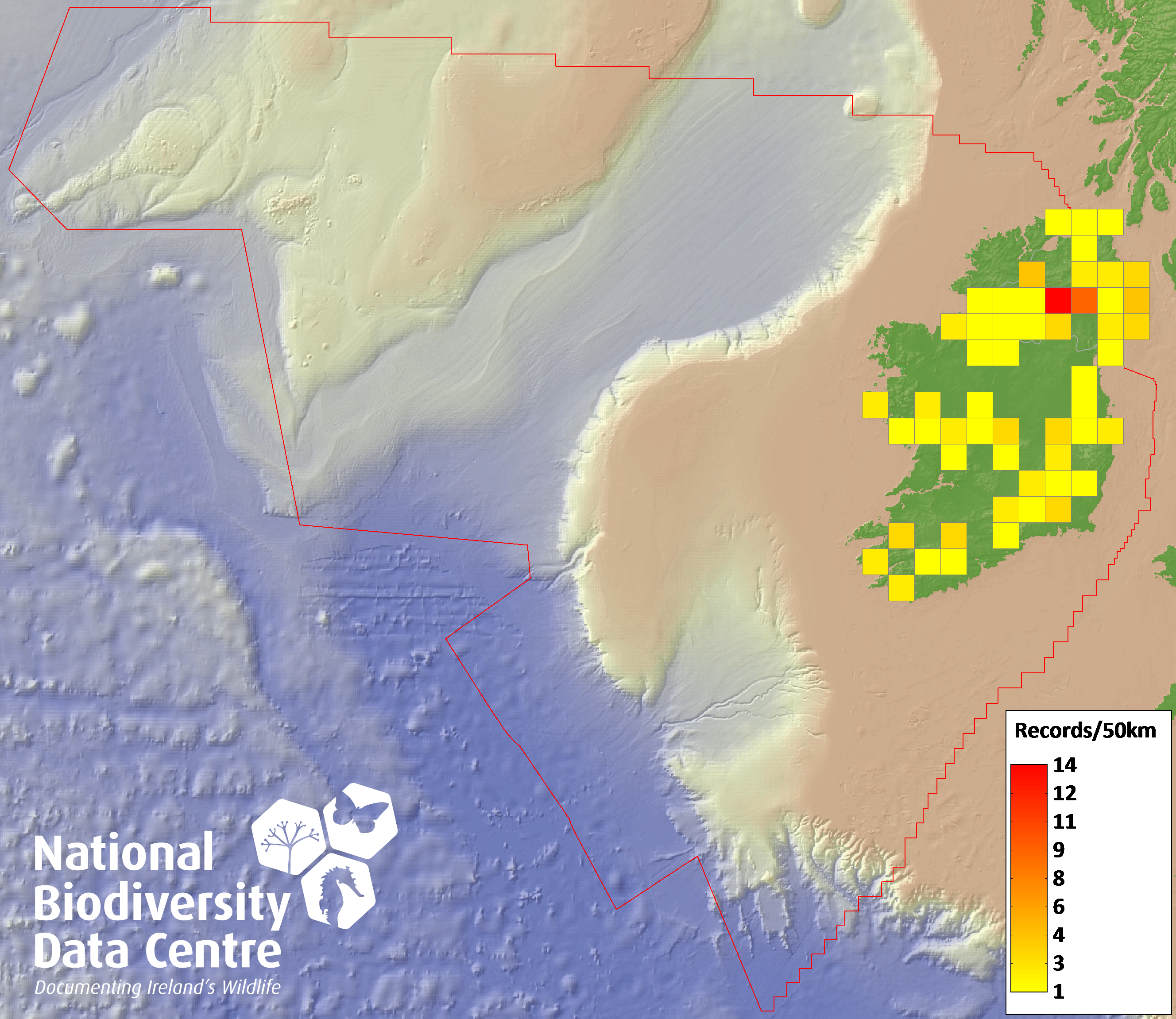 Distribution of the number of records recorded within each 10km grid square (ITM).Marine Map - 50km