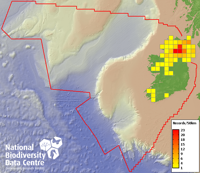 Distribution of the number of records recorded within each 10km grid square (ITM).Marine Map - 50km