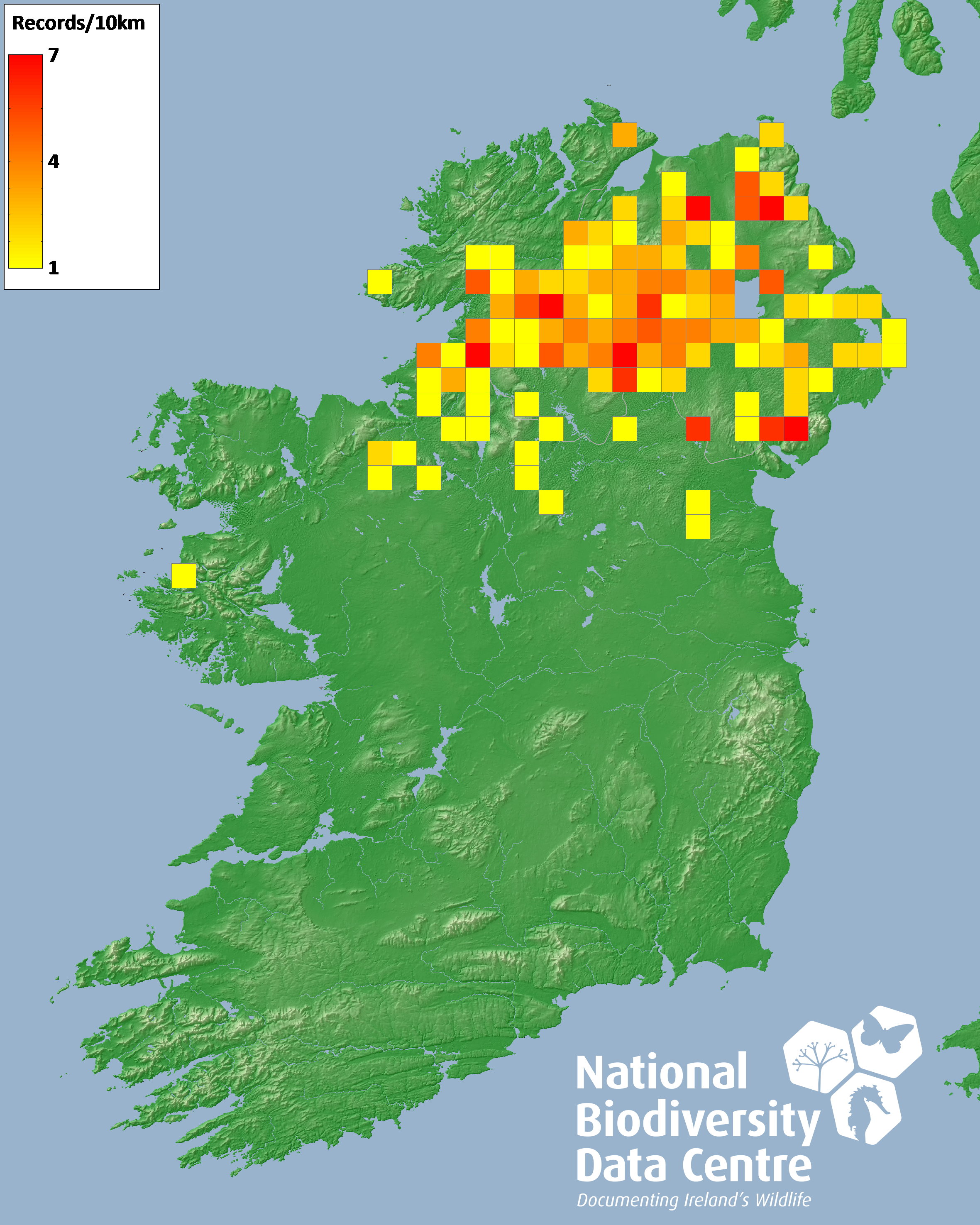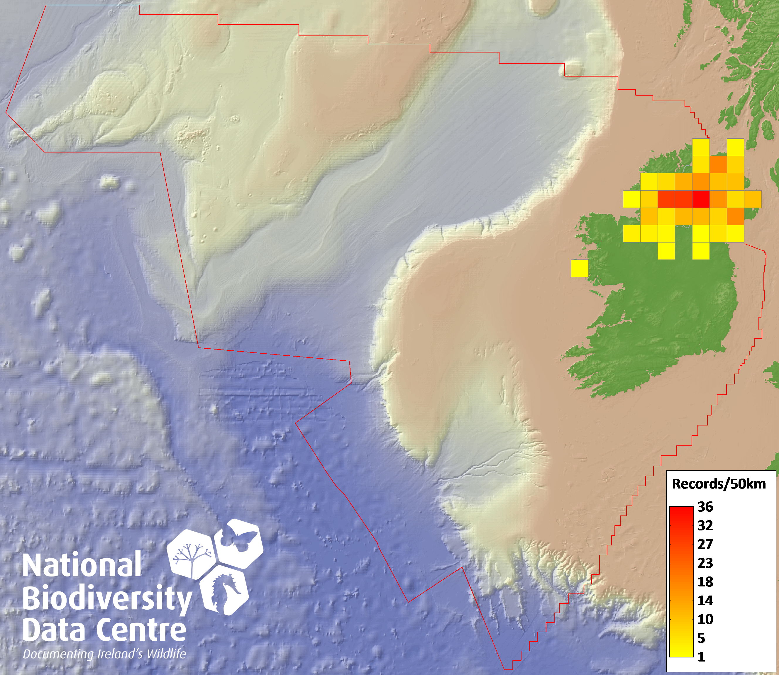 Distribution of the number of records recorded within each 10km grid square (ITM).Marine Map - 50km