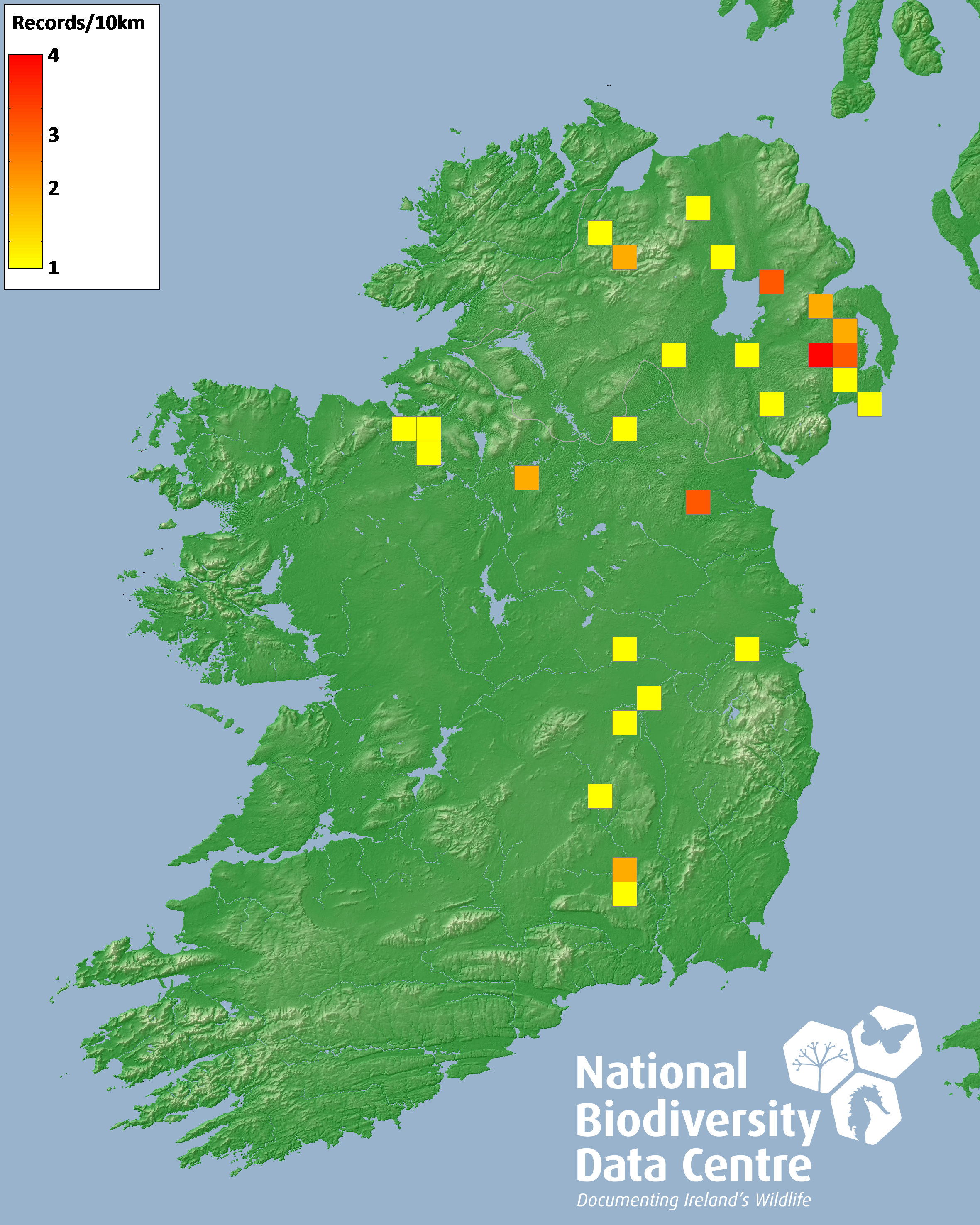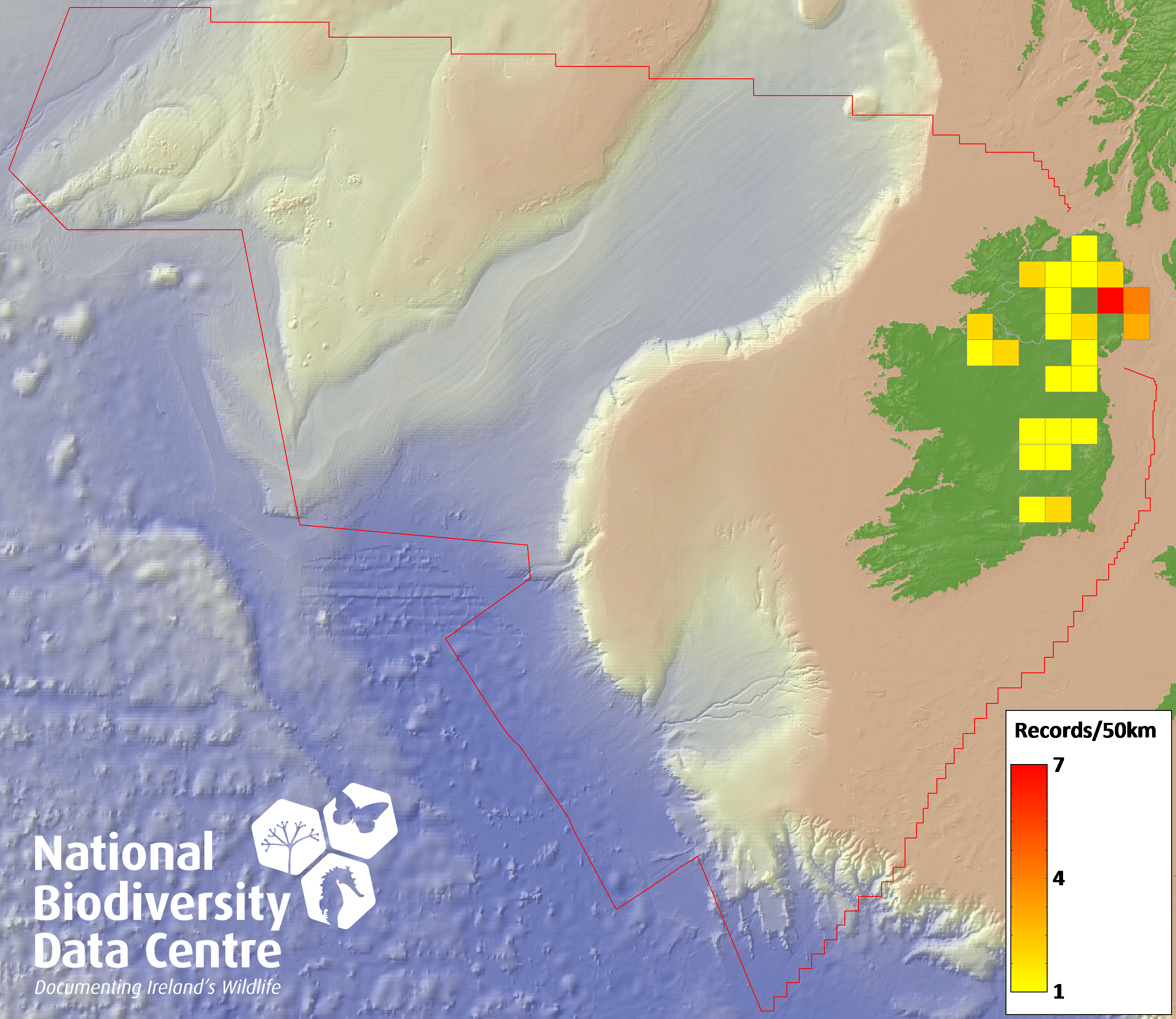 Distribution of the number of records recorded within each 10km grid square (ITM).Marine Map - 50km