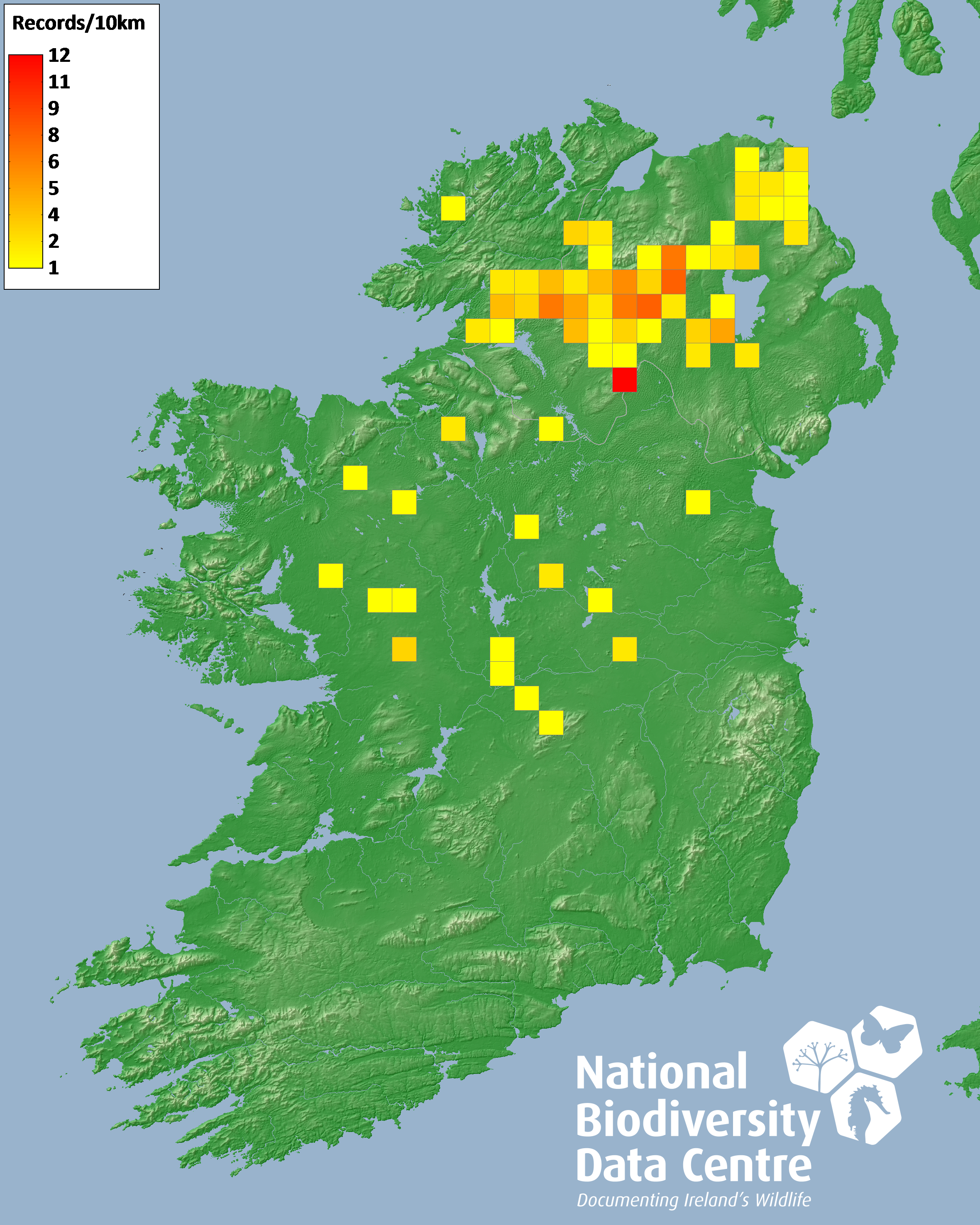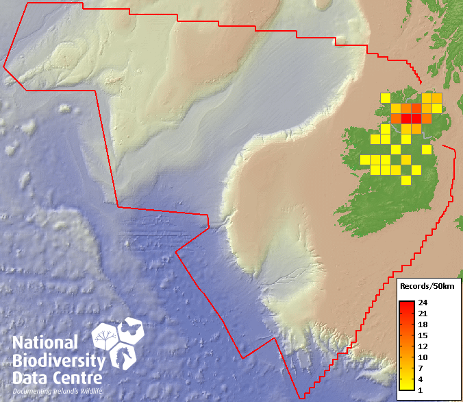 Distribution of the number of records recorded within each 10km grid square (ITM).Marine Map - 50km