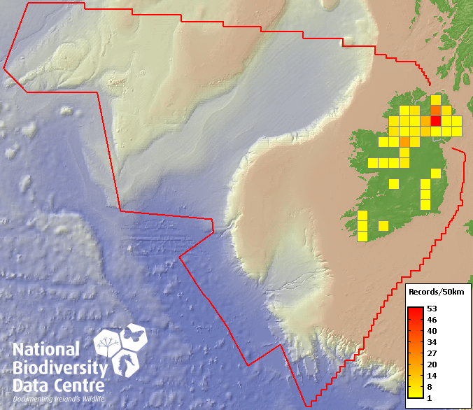 Distribution of the number of records recorded within each 10km grid square (ITM).Marine Map - 50km