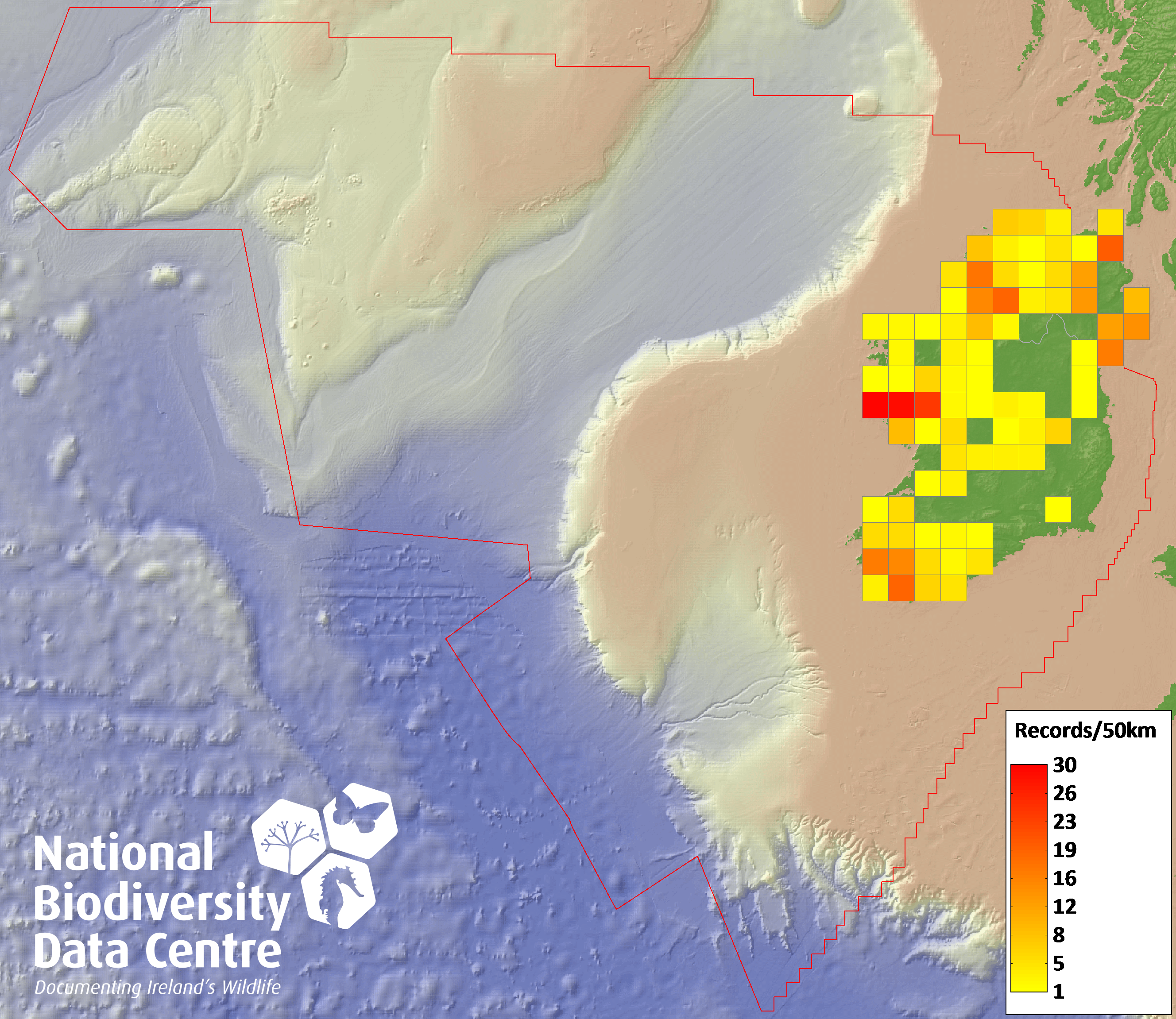 Distribution of the number of records recorded within each 10km grid square (ITM).Marine Map - 50km