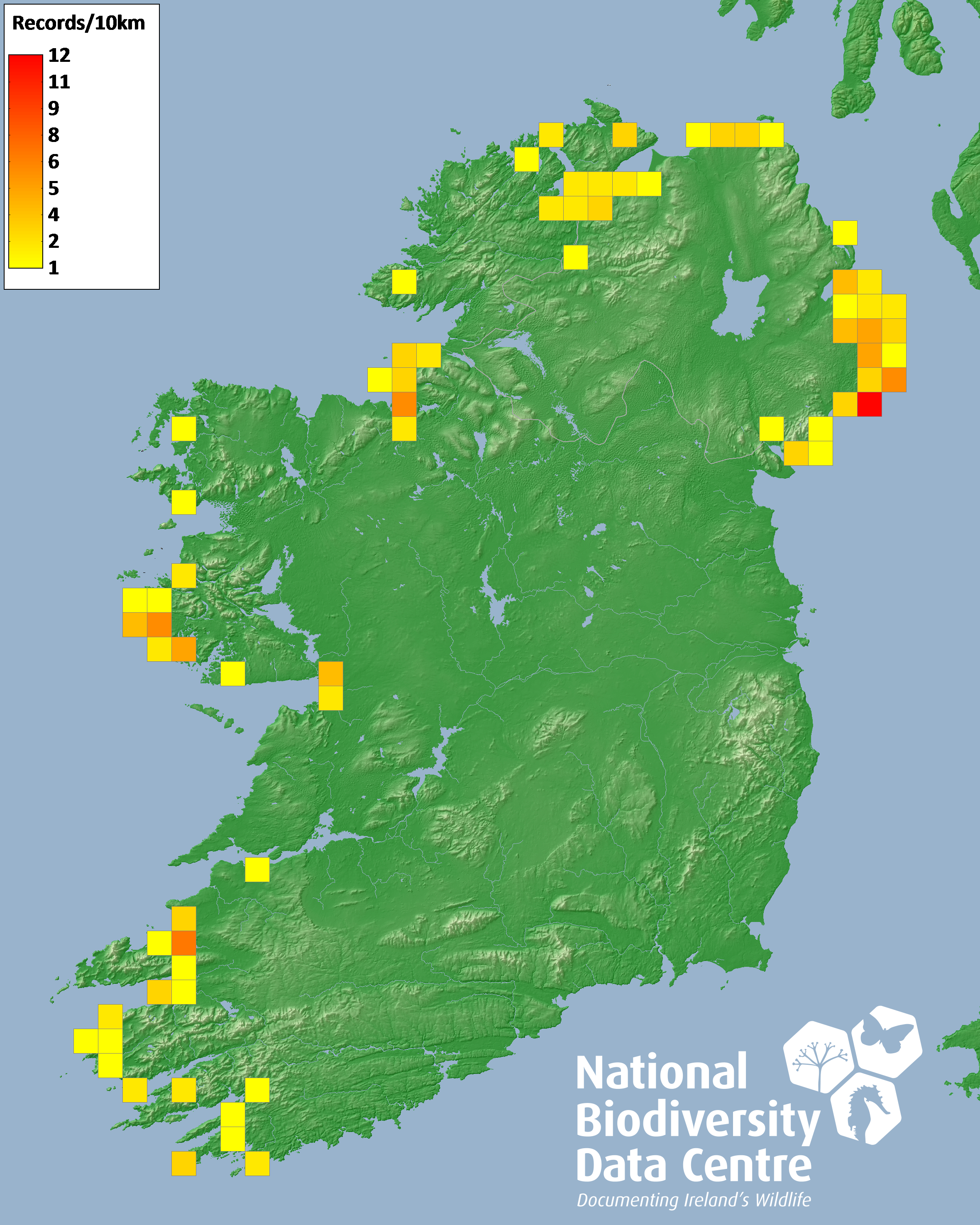 Distribution of the number of records recorded within each 10km grid square (ITM).Marine Map - 50km