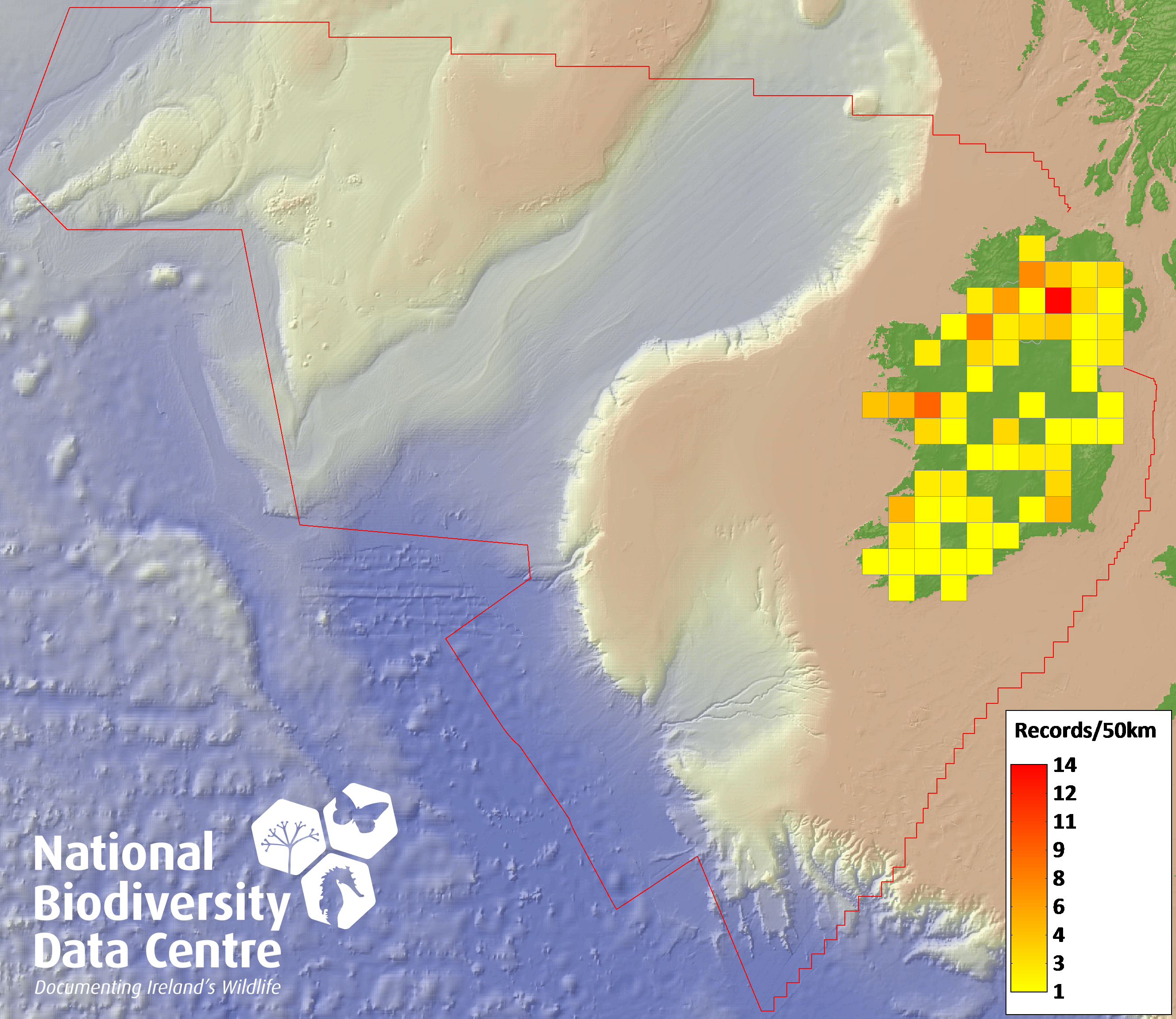 Distribution of the number of records recorded within each 10km grid square (ITM).Marine Map - 50km