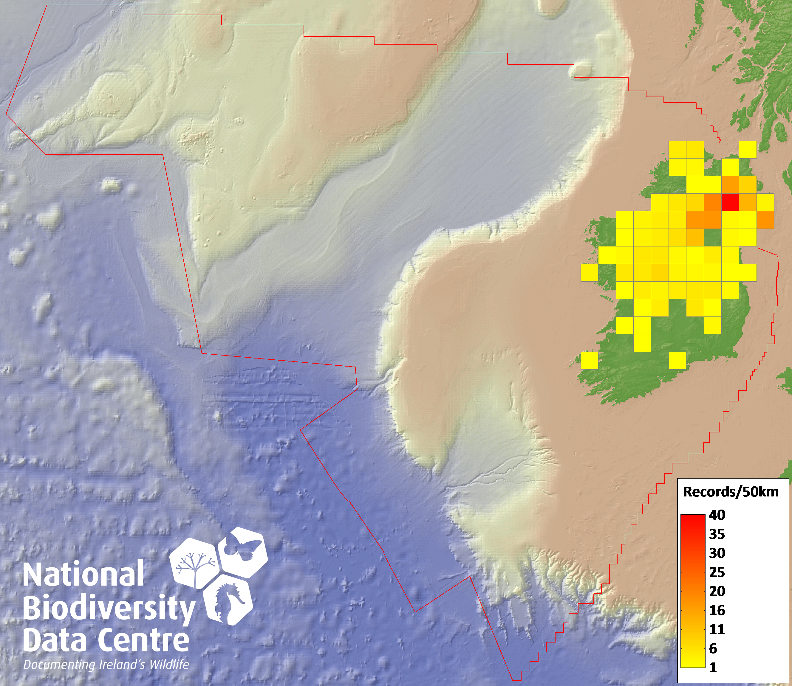 Distribution of the number of records recorded within each 10km grid square (ITM).Marine Map - 50km