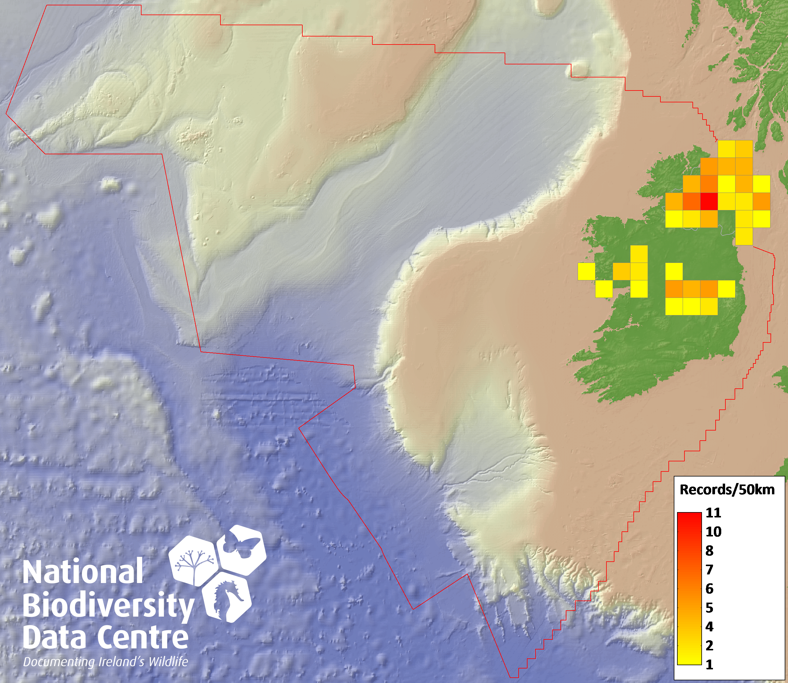 Distribution of the number of records recorded within each 10km grid square (ITM).Marine Map - 50km