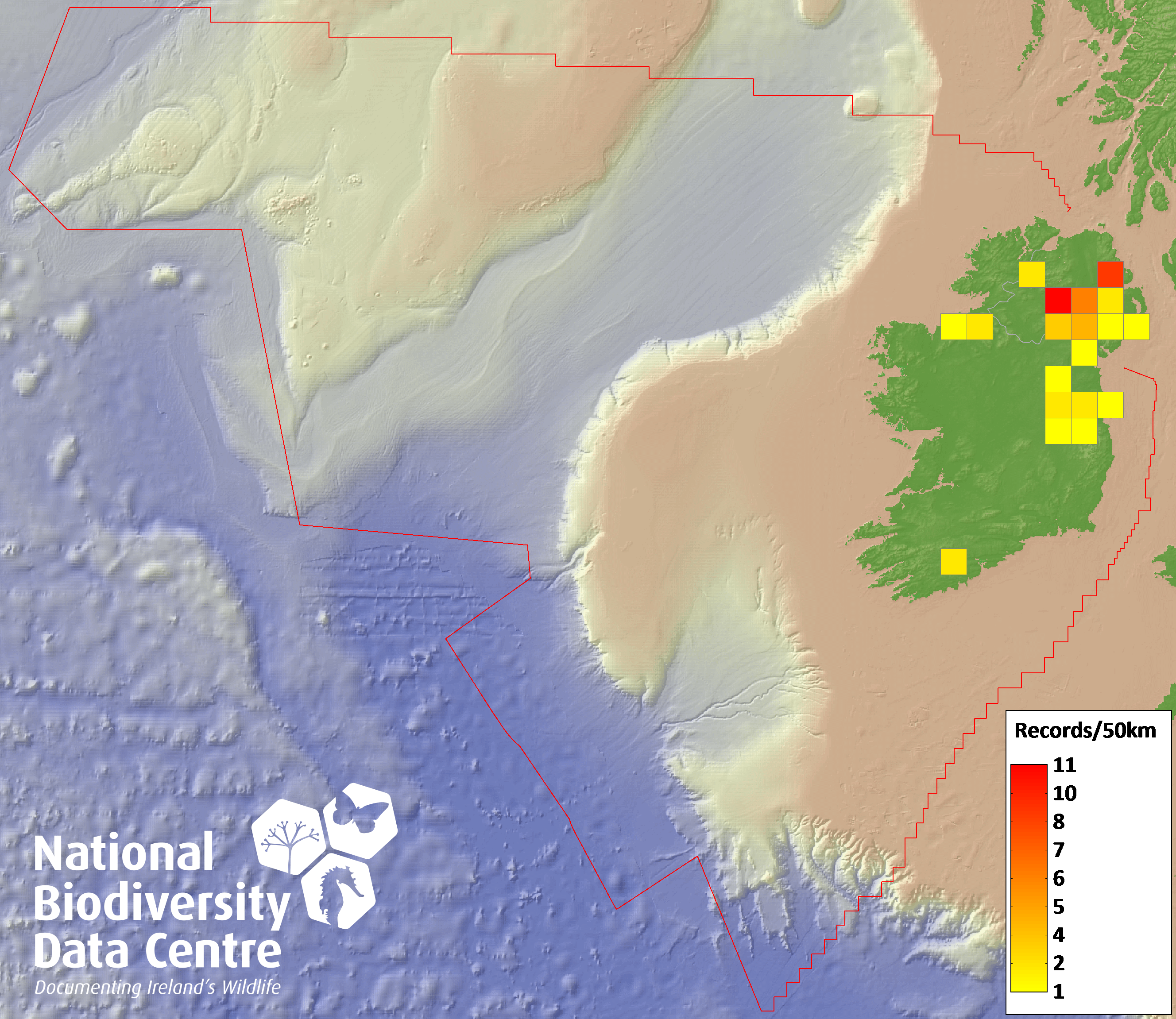 Distribution of the number of records recorded within each 10km grid square (ITM).Marine Map - 50km