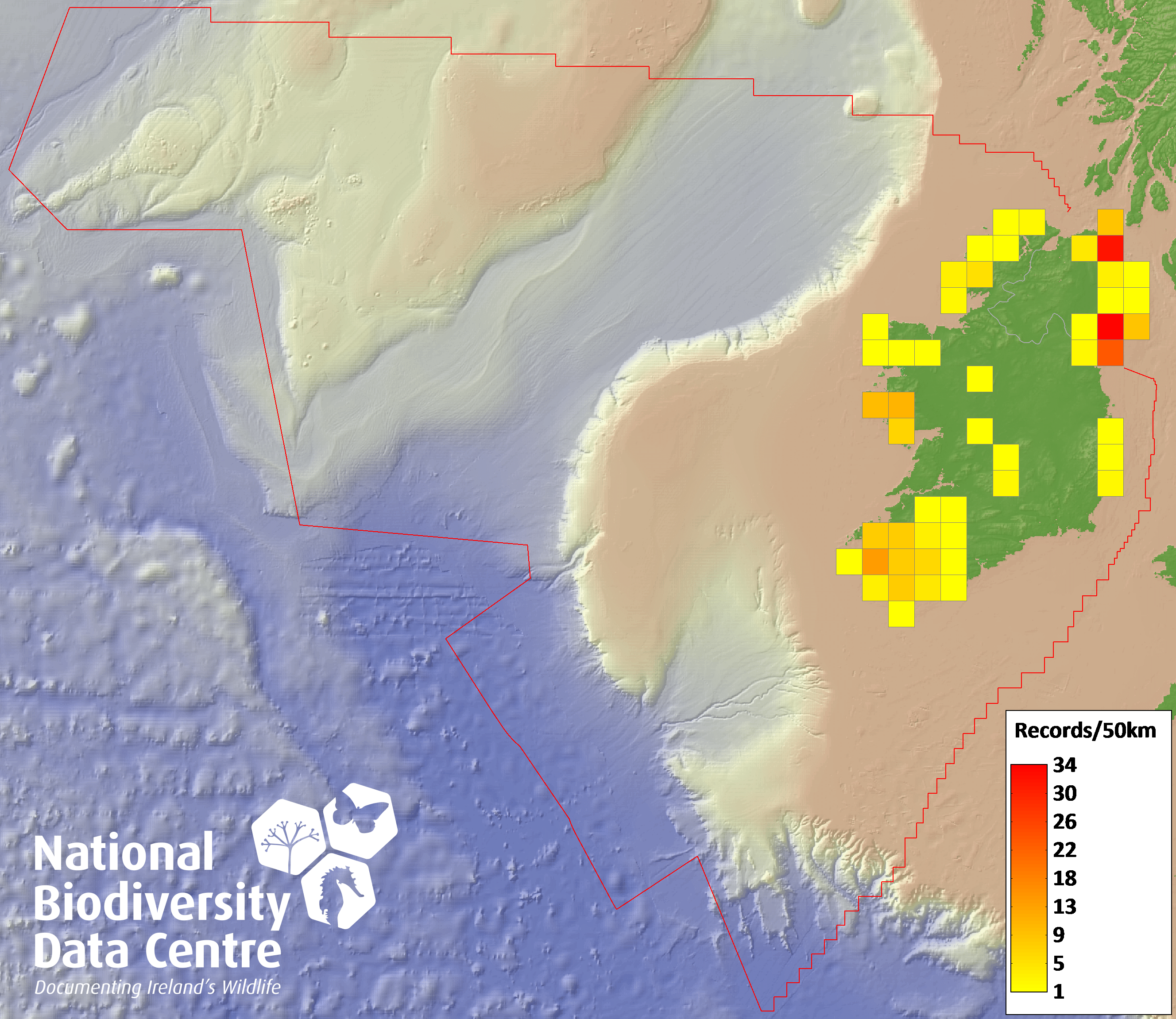 Distribution of the number of records recorded within each 10km grid square (ITM).Marine Map - 50km