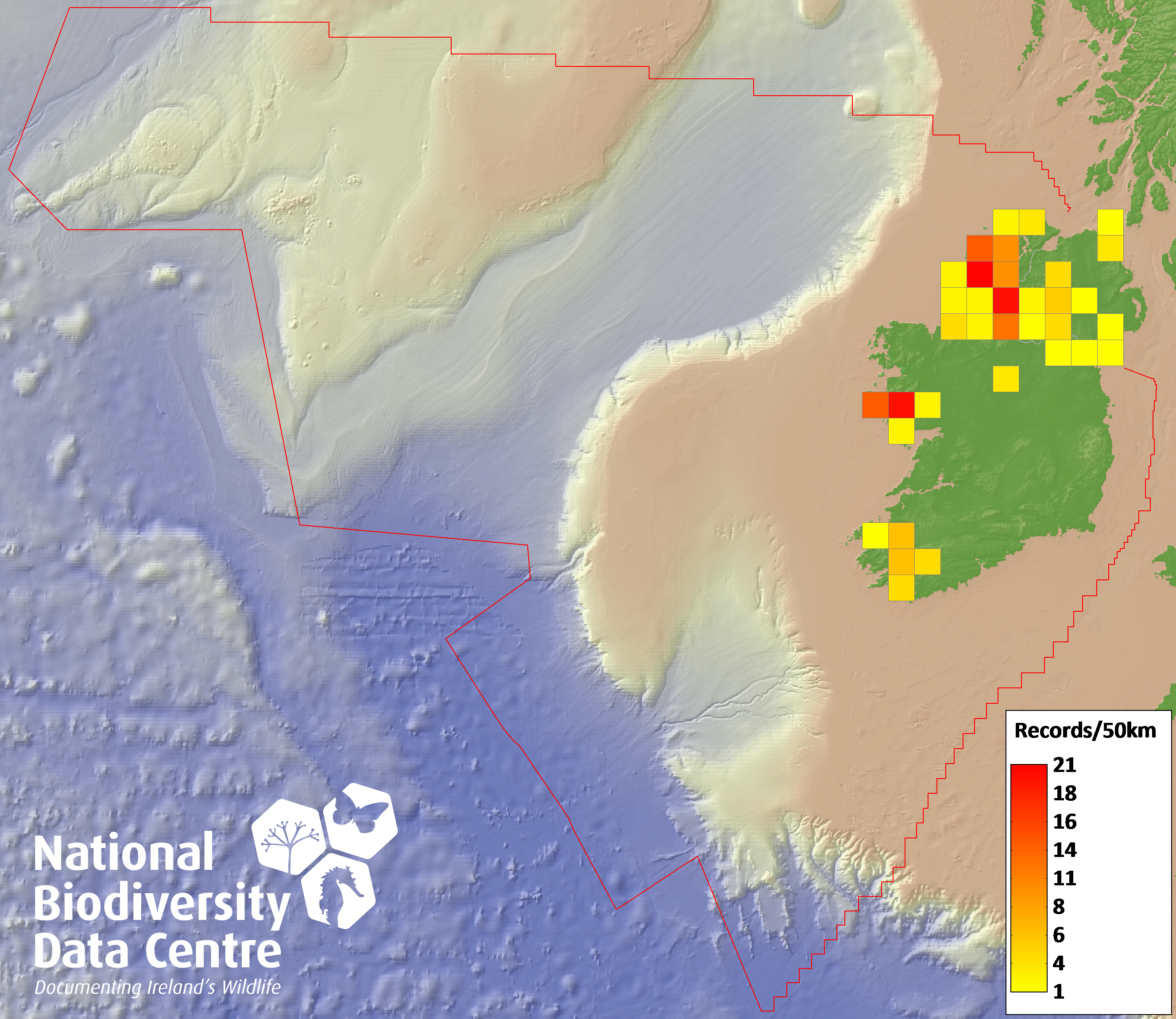 Distribution of the number of records recorded within each 10km grid square (ITM).Marine Map - 50km