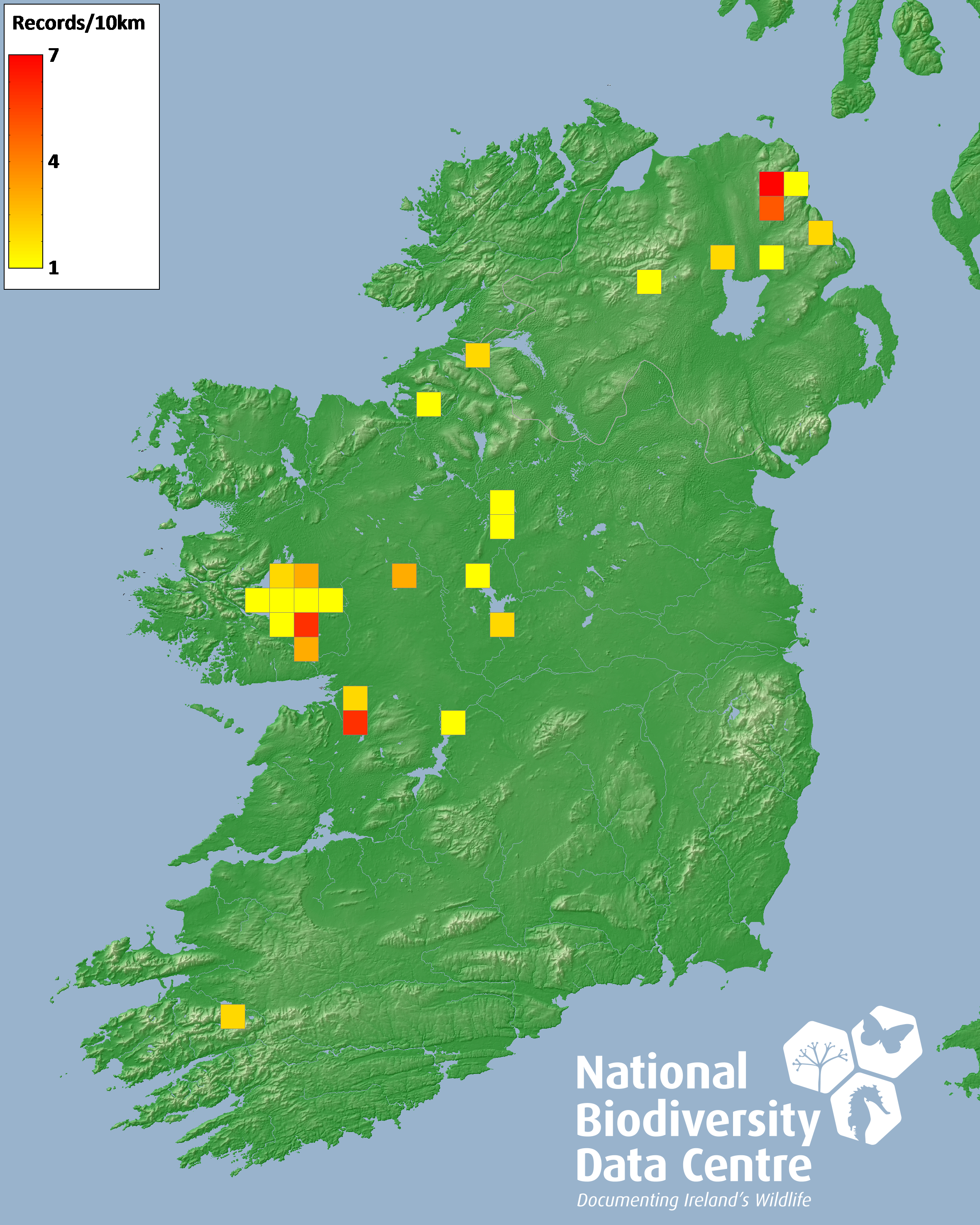 Distribution of the number of records recorded within each 10km grid square (ITM).Marine Map - 50km