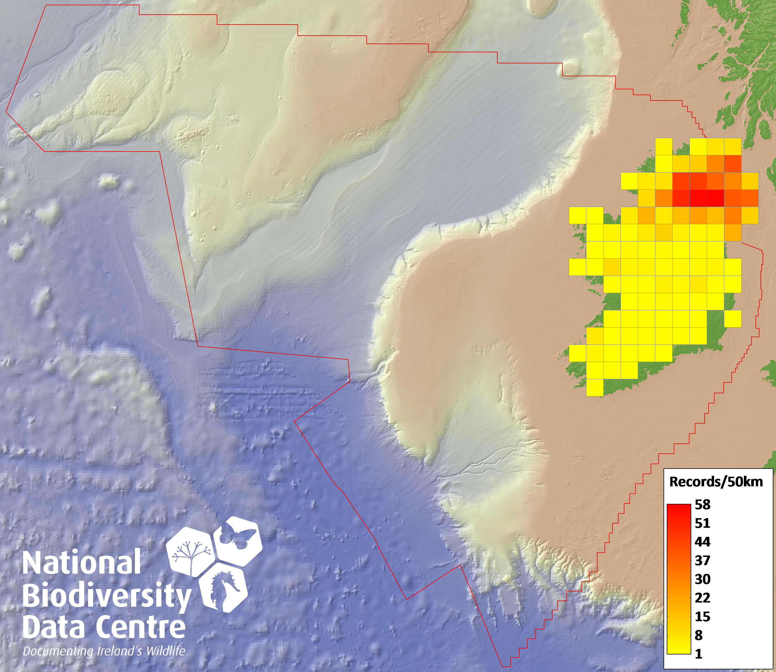 Distribution of the number of records recorded within each 10km grid square (ITM).Marine Map - 50km