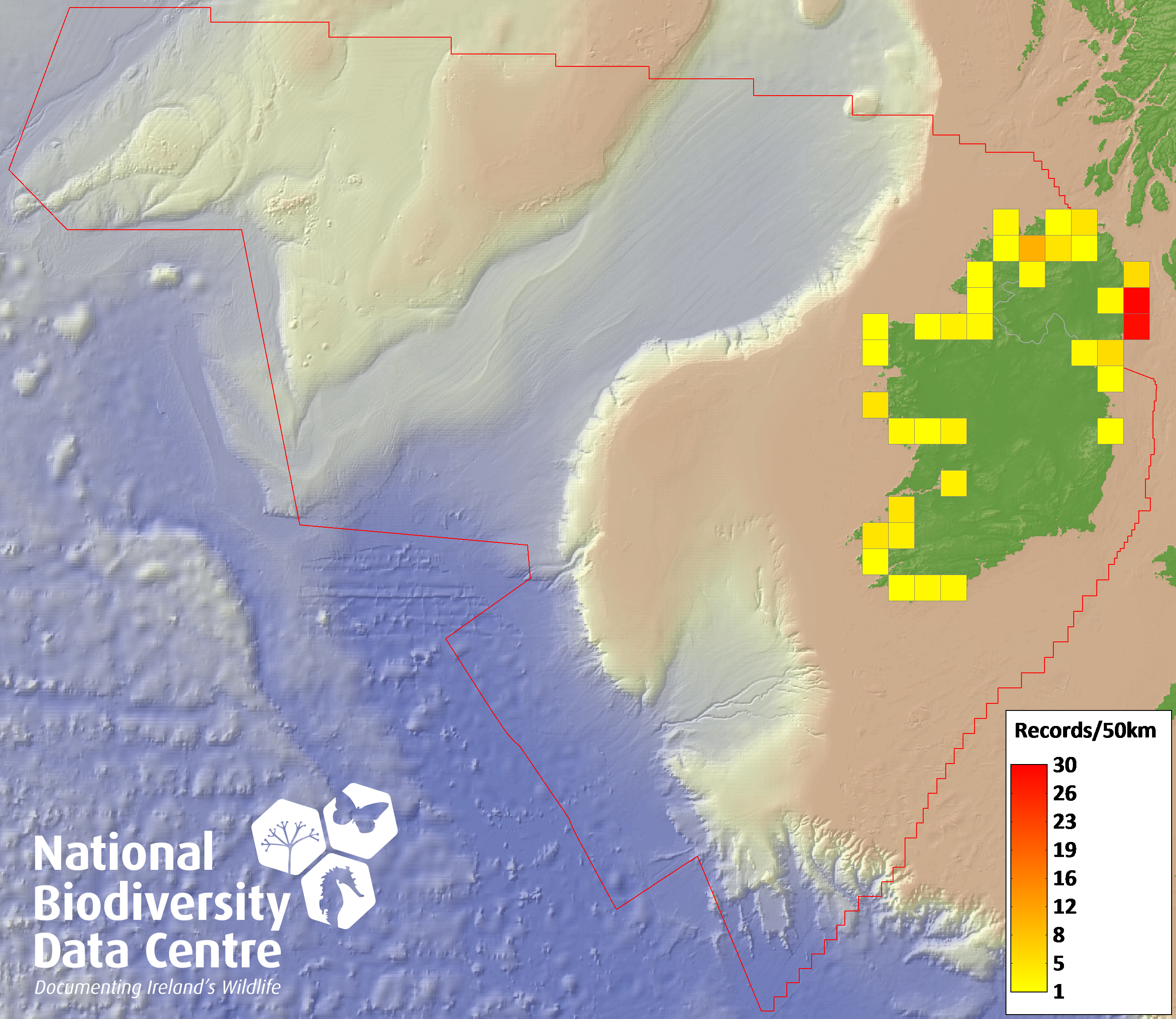Distribution of the number of records recorded within each 10km grid square (ITM).Marine Map - 50km