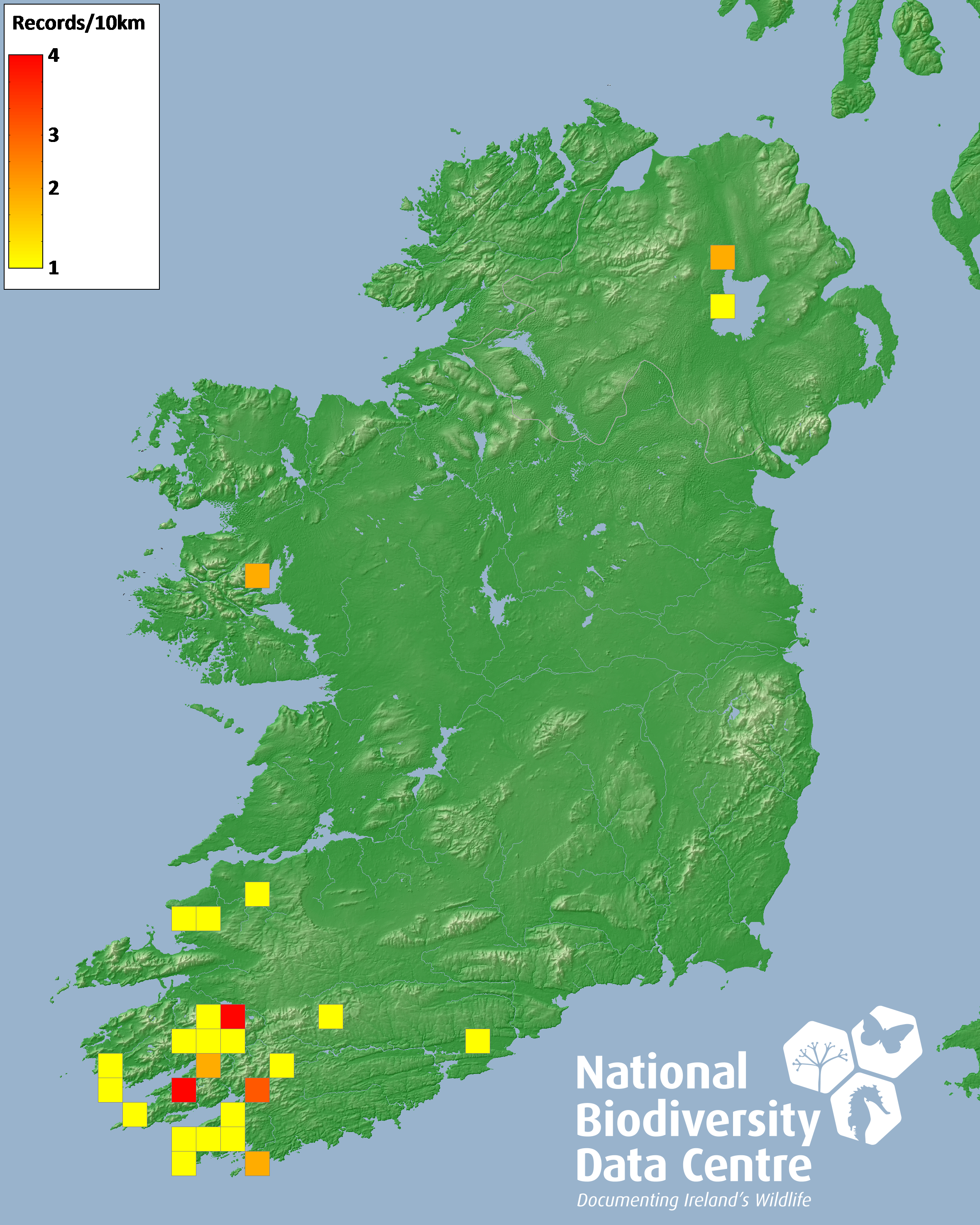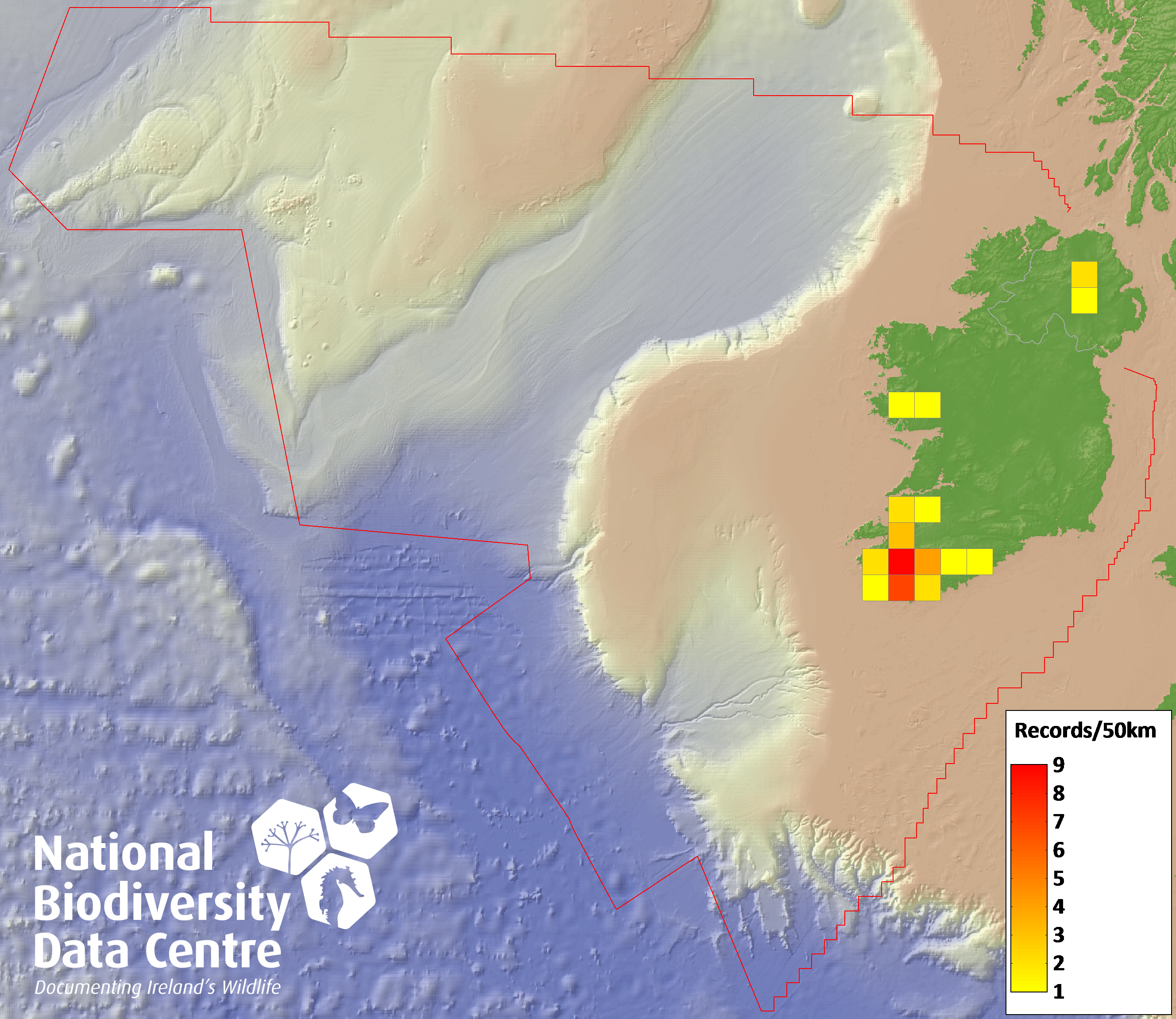 Distribution of the number of records recorded within each 10km grid square (ITM).Marine Map - 50km