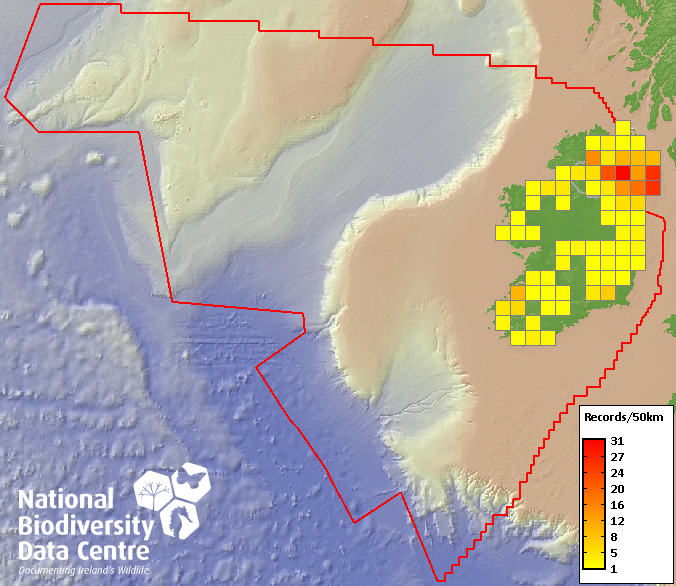Distribution of the number of records recorded within each 10km grid square (ITM).Marine Map - 50km