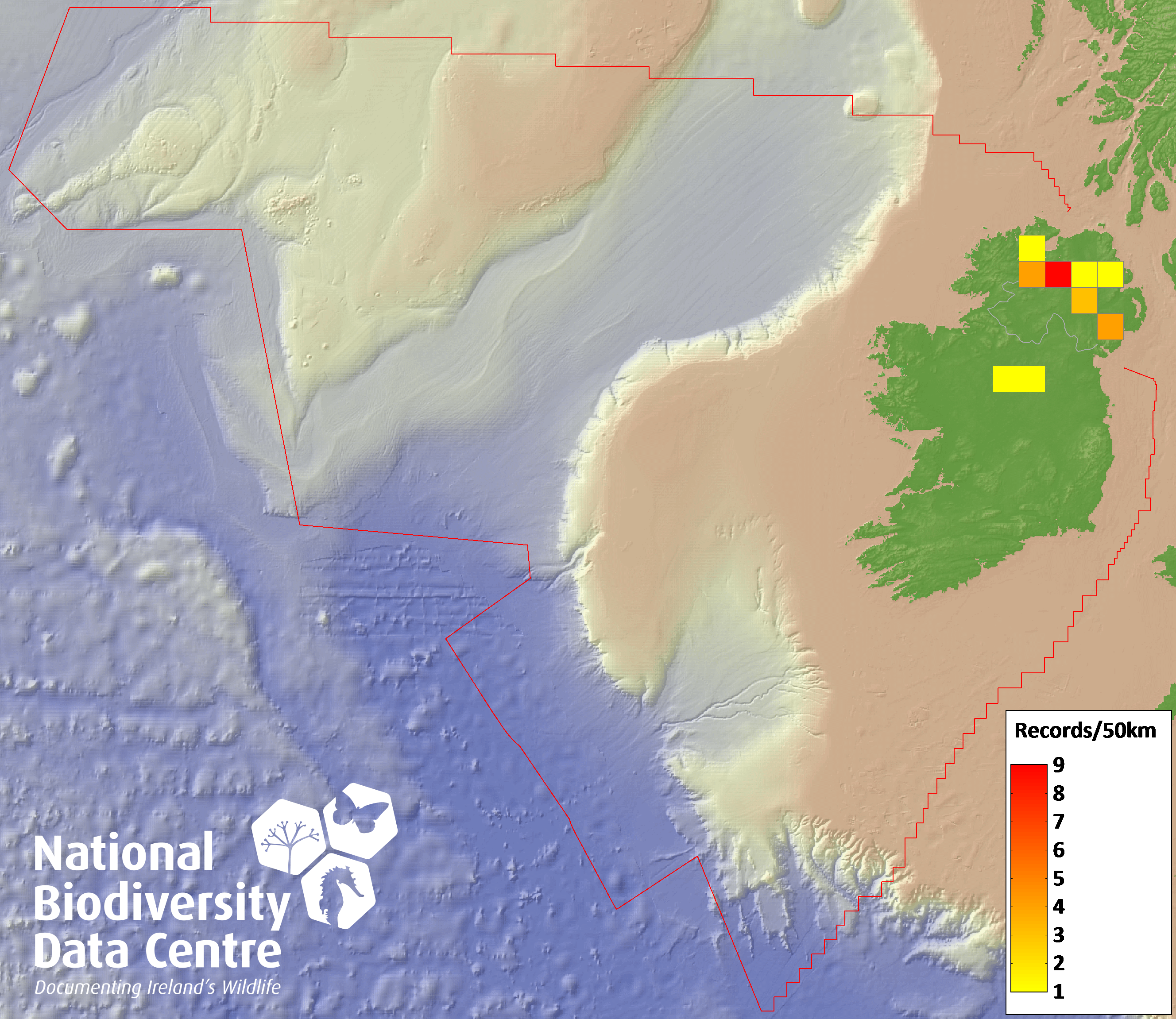 Distribution of the number of records recorded within each 10km grid square (ITM).Marine Map - 50km