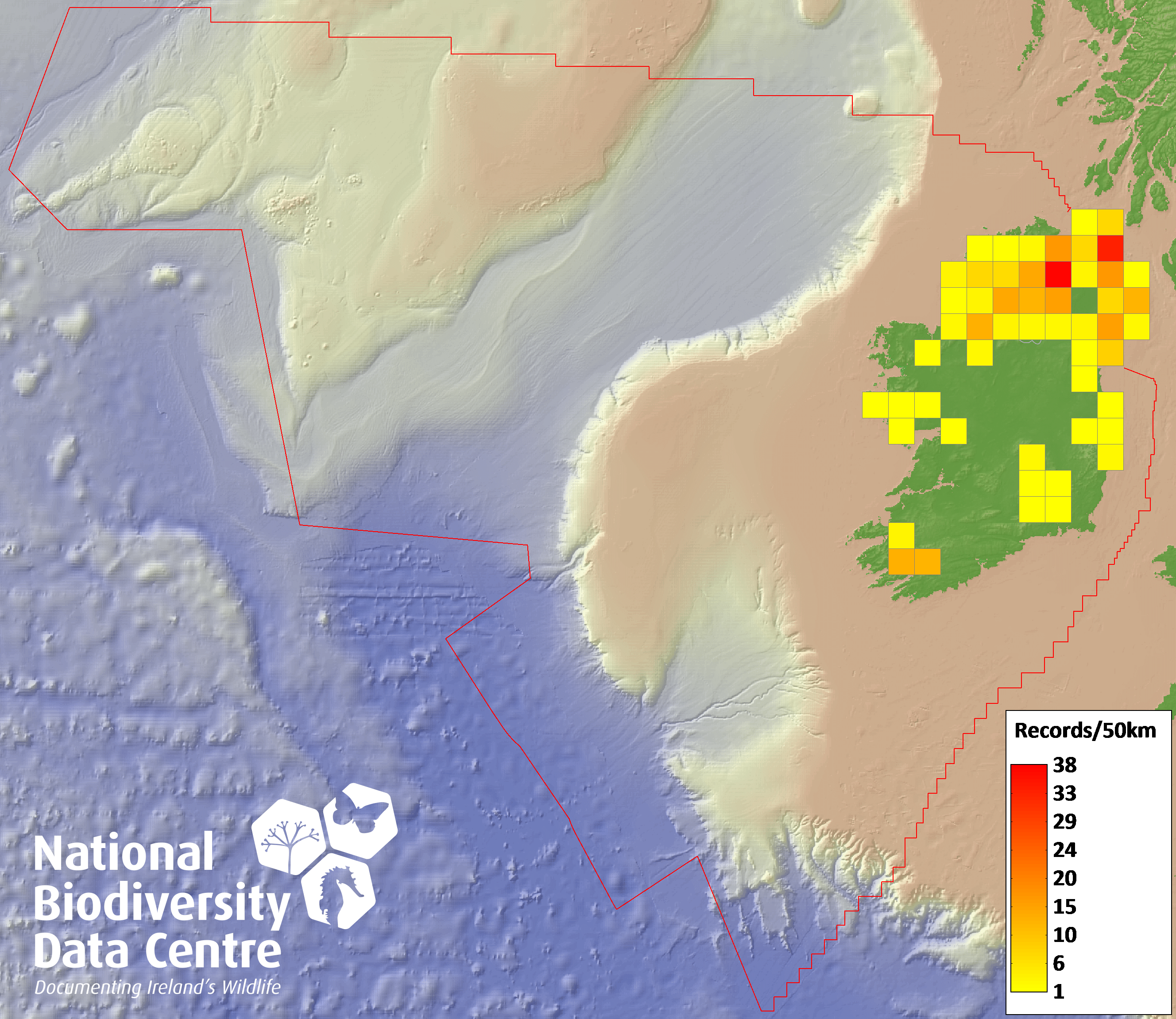 Distribution of the number of records recorded within each 10km grid square (ITM).Marine Map - 50km