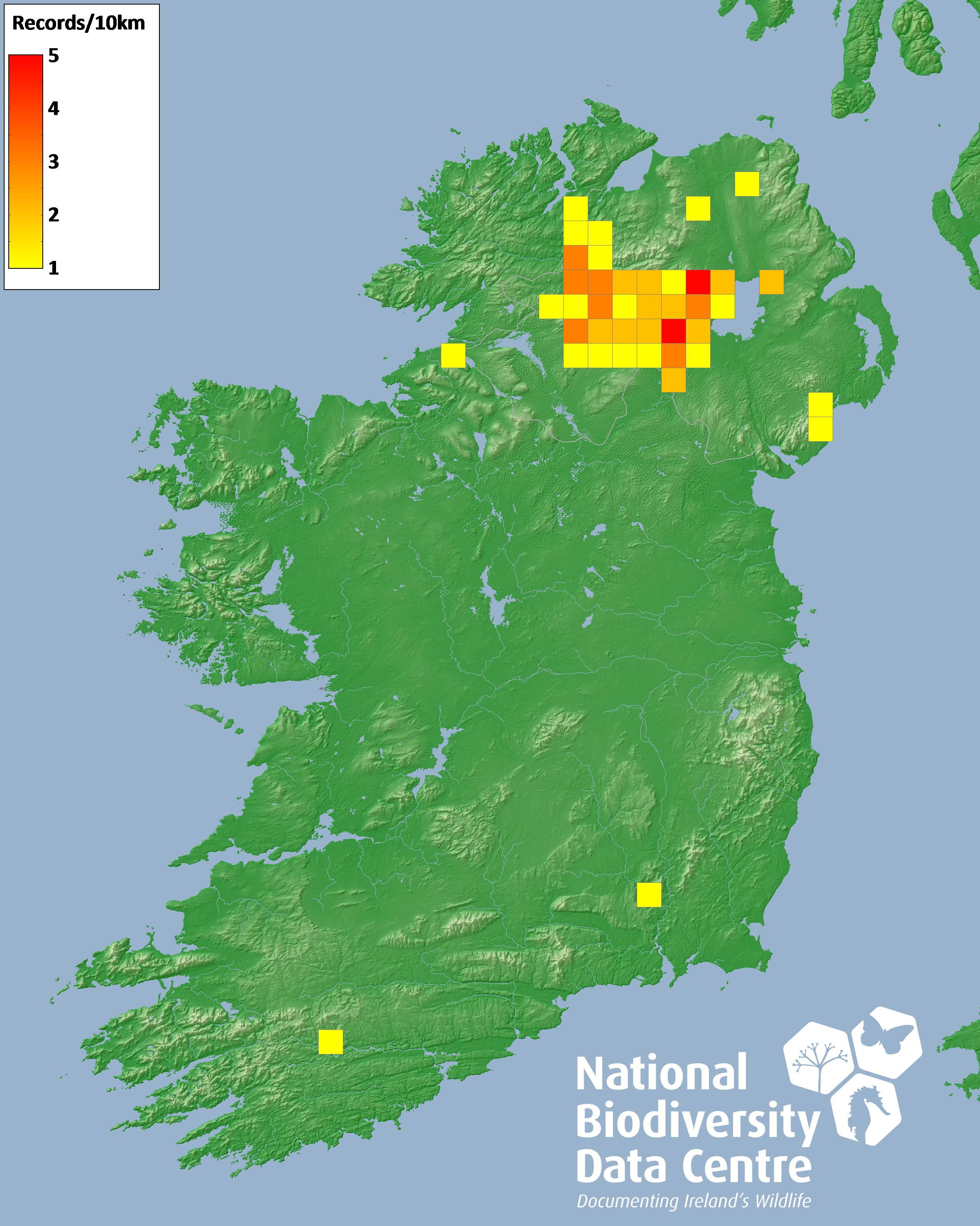 Distribution of the number of records recorded within each 10km grid square (ITM).Marine Map - 50km