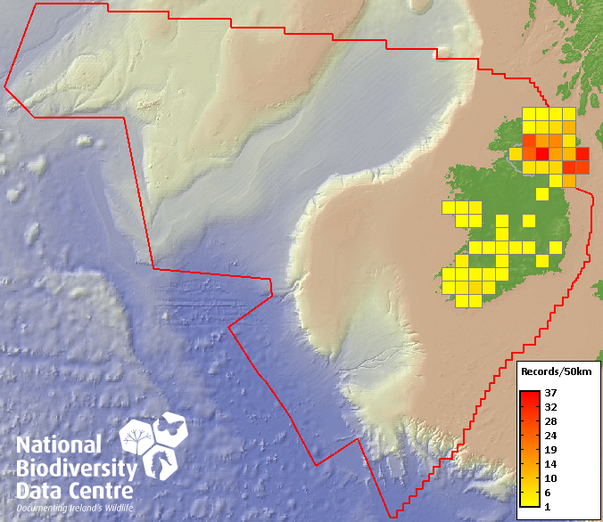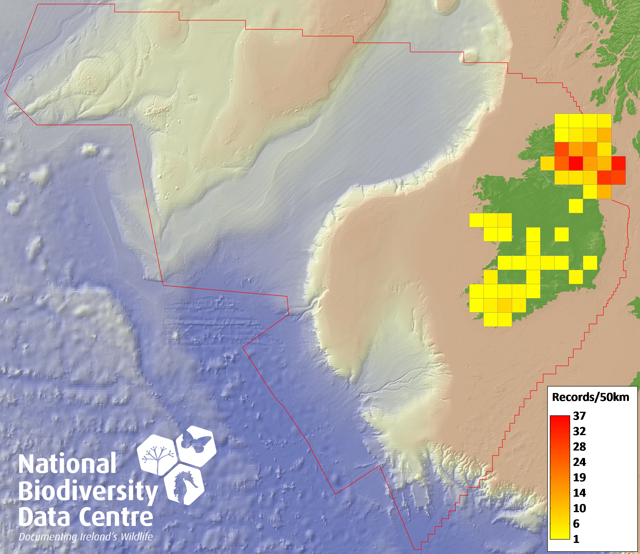 Distribution of the number of records recorded within each 10km grid square (ITM).Marine Map - 50km
