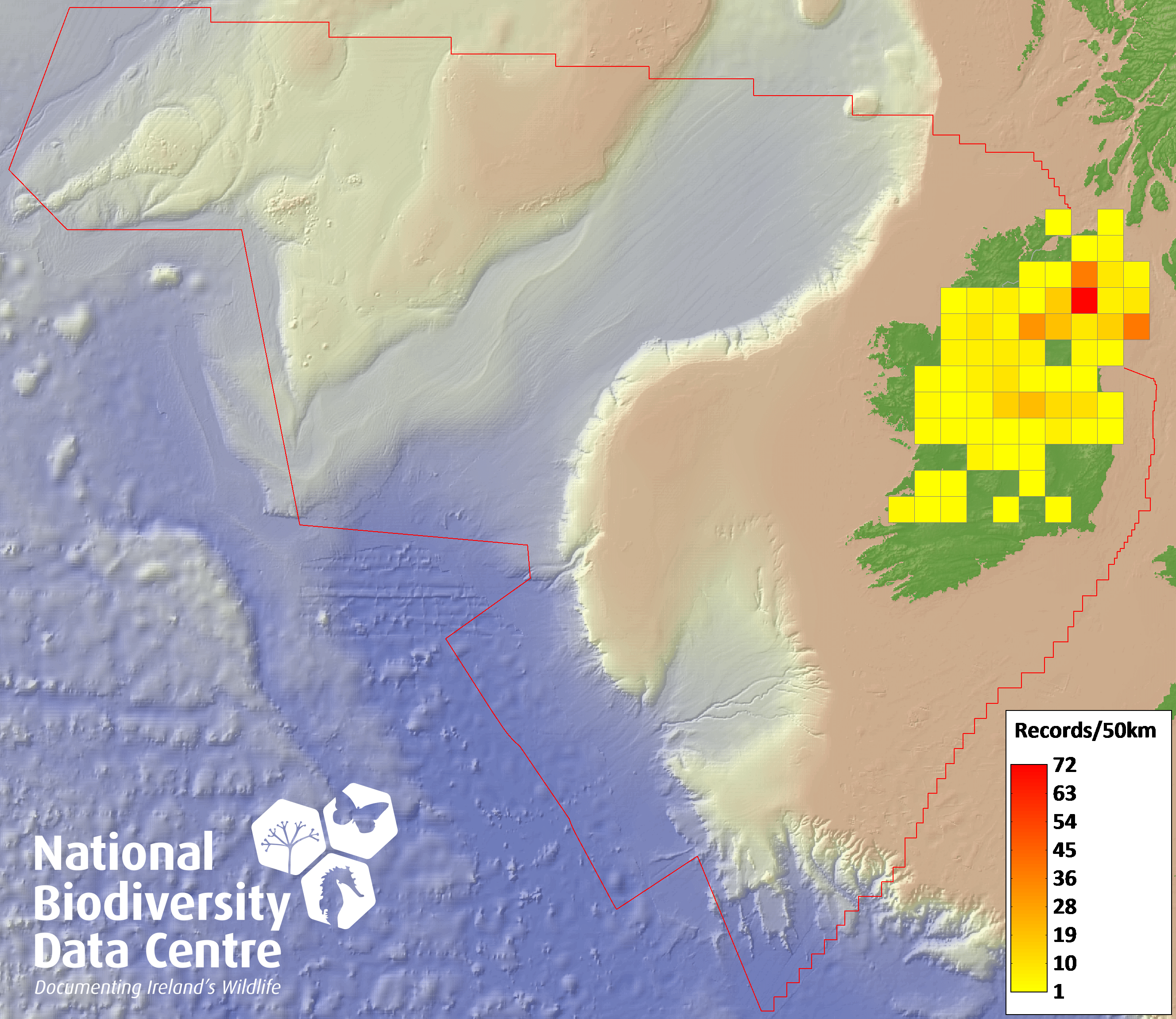 Distribution of the number of records recorded within each 10km grid square (ITM).Marine Map - 50km