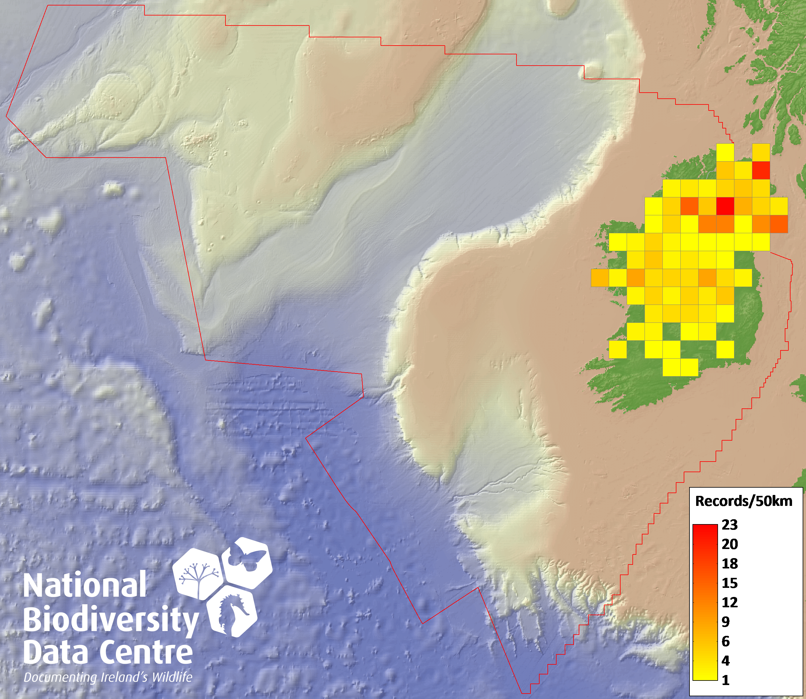 Distribution of the number of records recorded within each 10km grid square (ITM).Marine Map - 50km