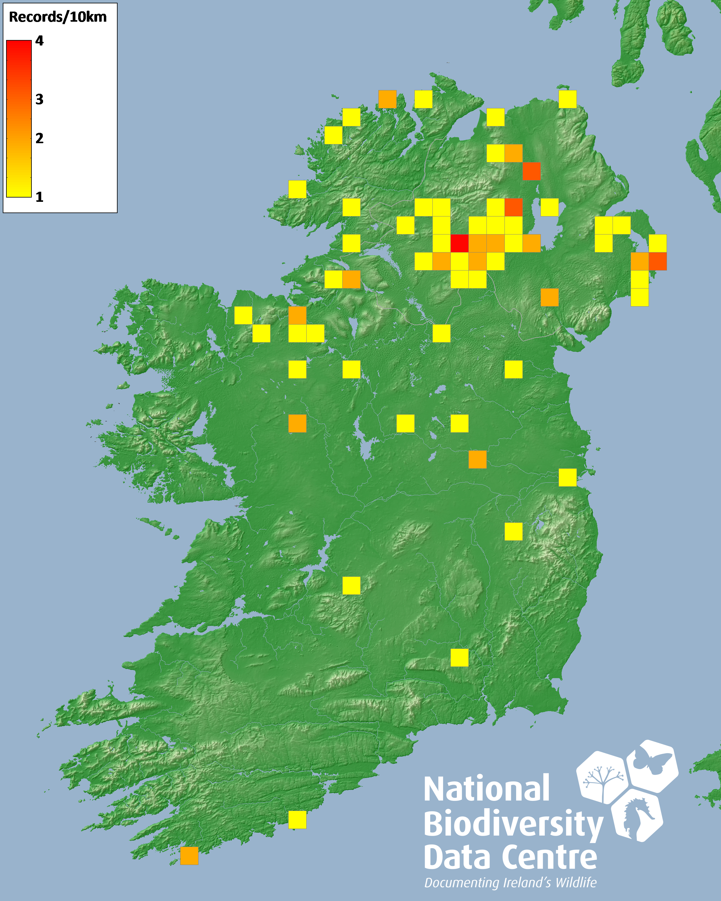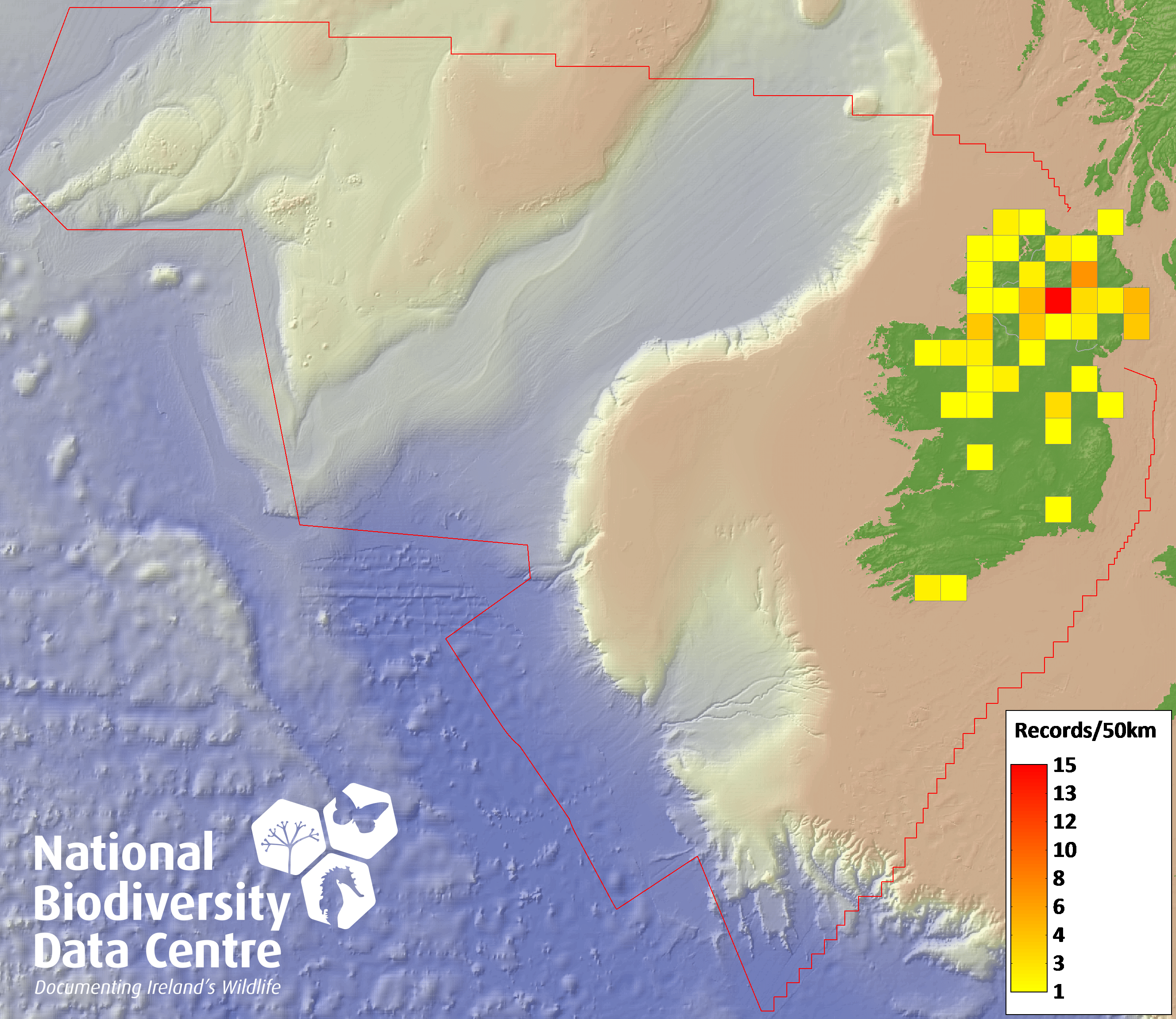 Distribution of the number of records recorded within each 10km grid square (ITM).Marine Map - 50km