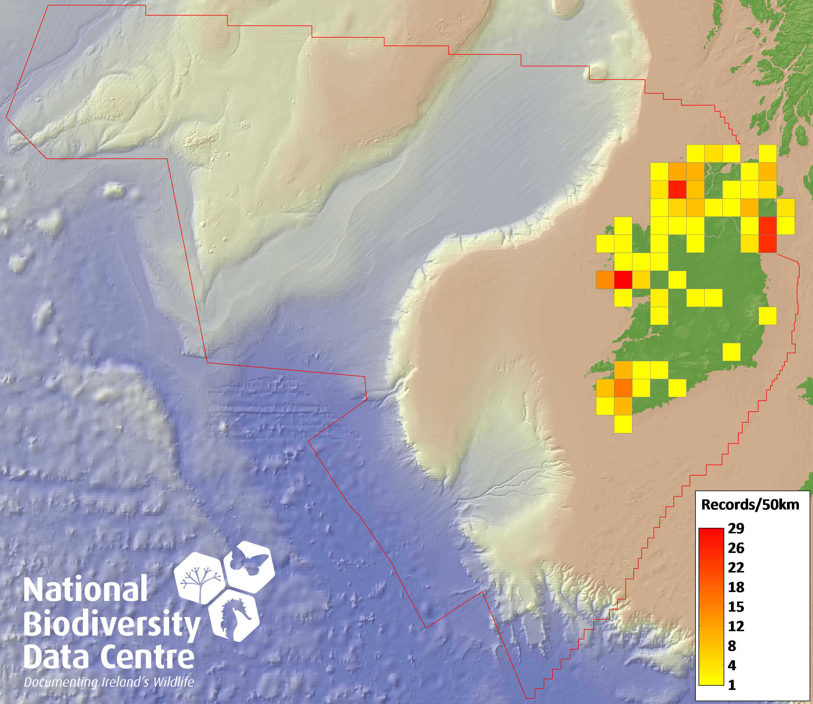 Distribution of the number of records recorded within each 10km grid square (ITM).Marine Map - 50km