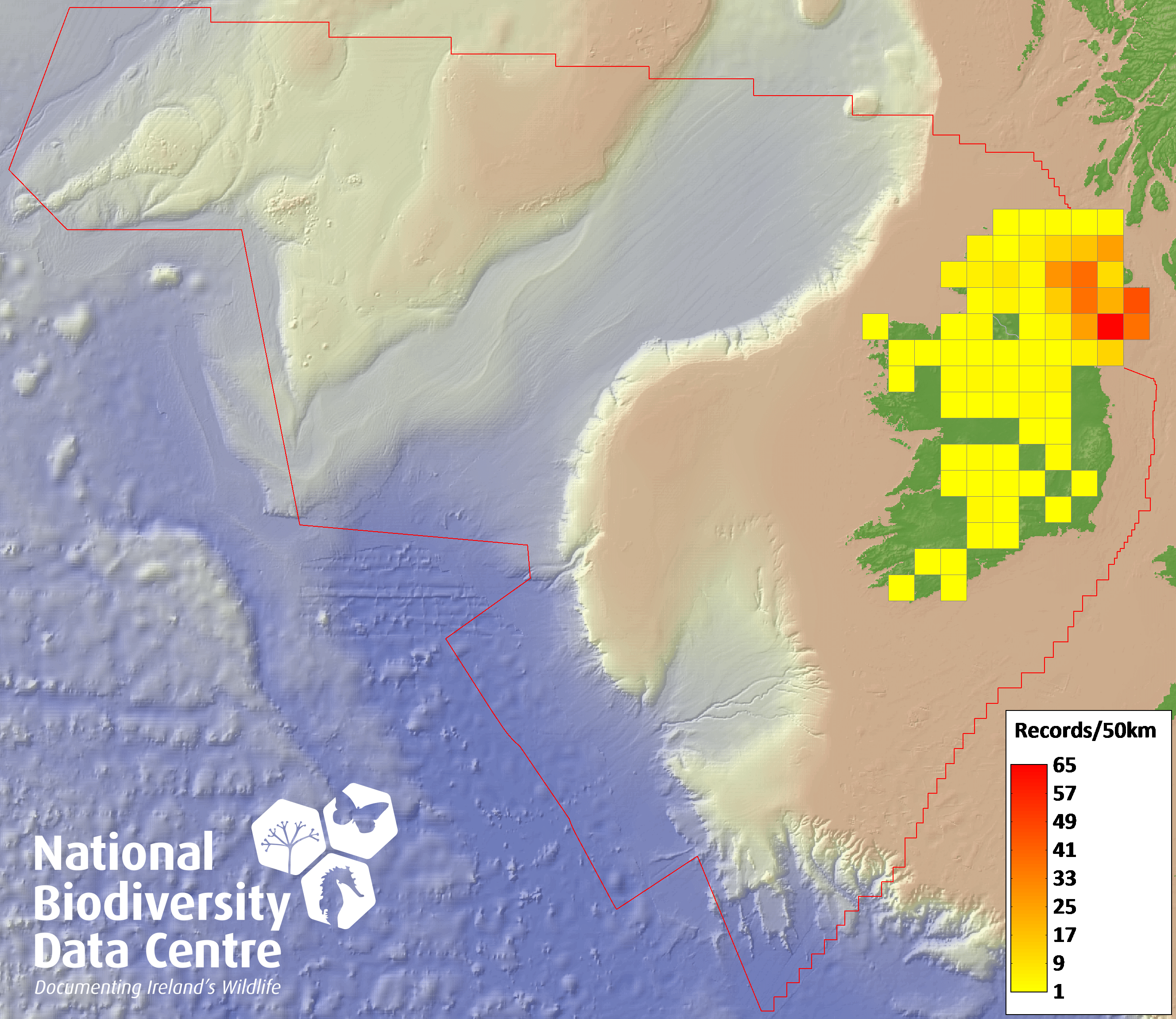 Distribution of the number of records recorded within each 10km grid square (ITM).Marine Map - 50km