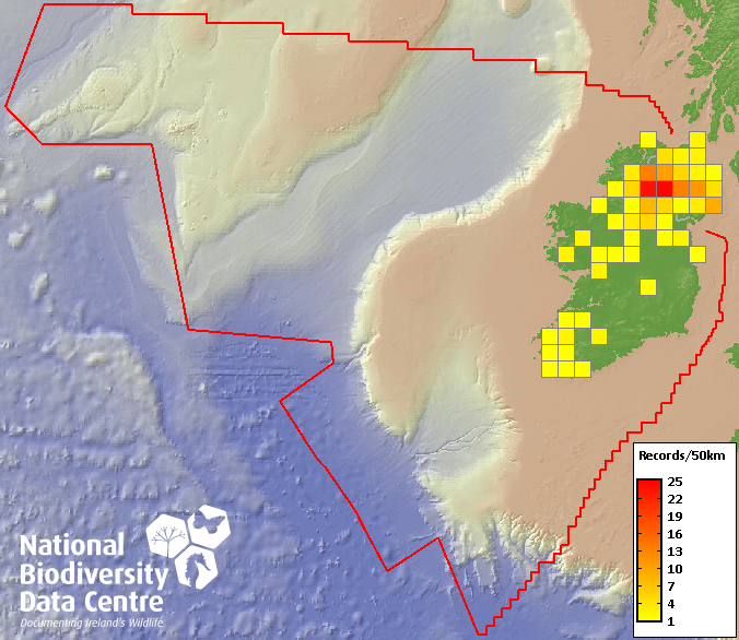Distribution of the number of records recorded within each 10km grid square (ITM).Marine Map - 50km
