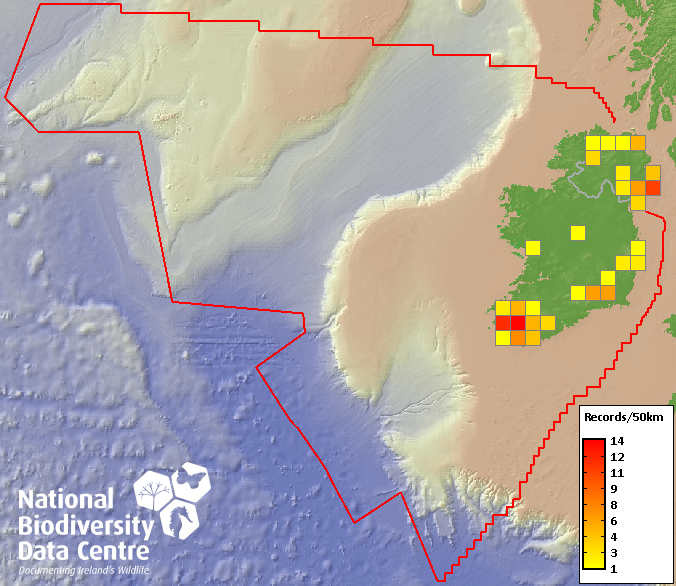 Distribution of the number of records recorded within each 10km grid square (ITM).Marine Map - 50km