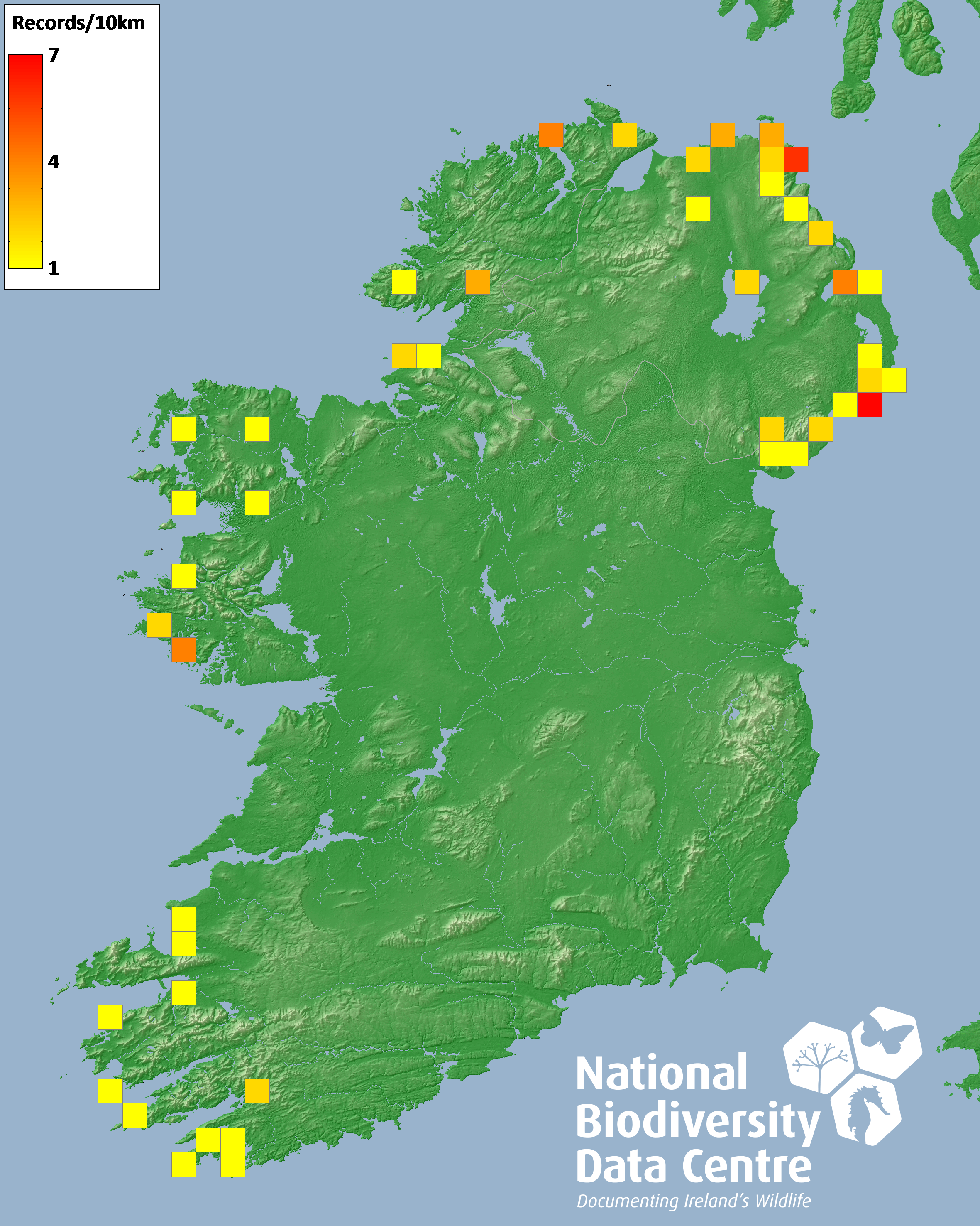 Distribution of the number of records recorded within each 10km grid square (ITM).Marine Map - 50km