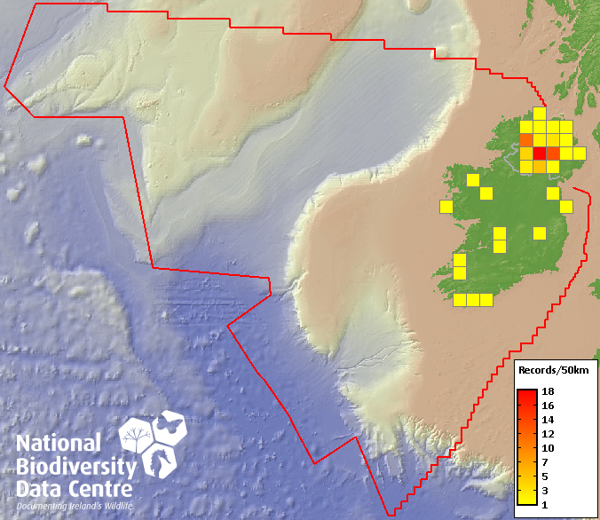 Distribution of the number of records recorded within each 10km grid square (ITM).Marine Map - 50km