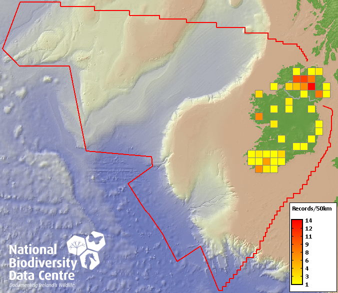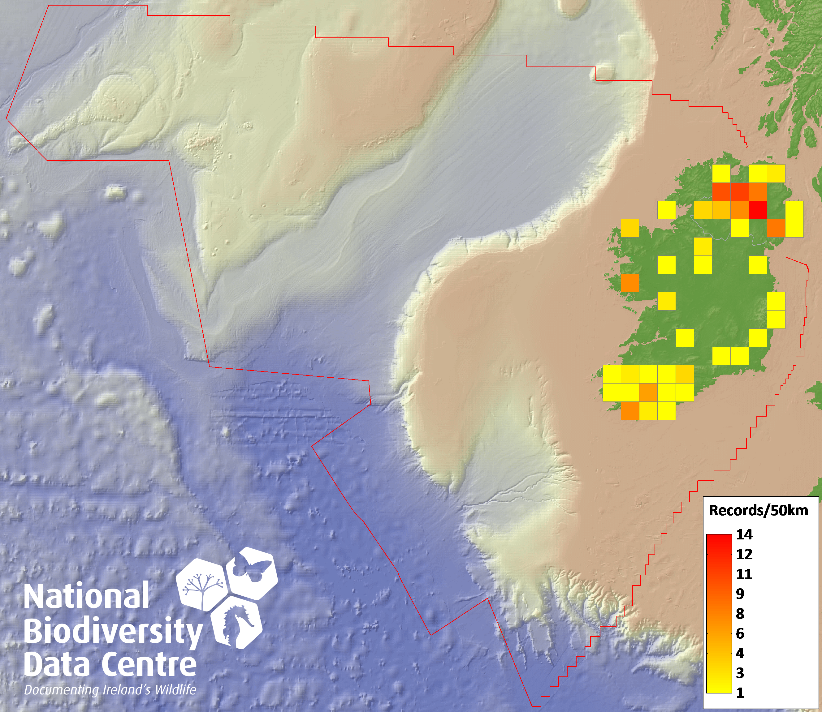 Distribution of the number of records recorded within each 10km grid square (ITM).Marine Map - 50km
