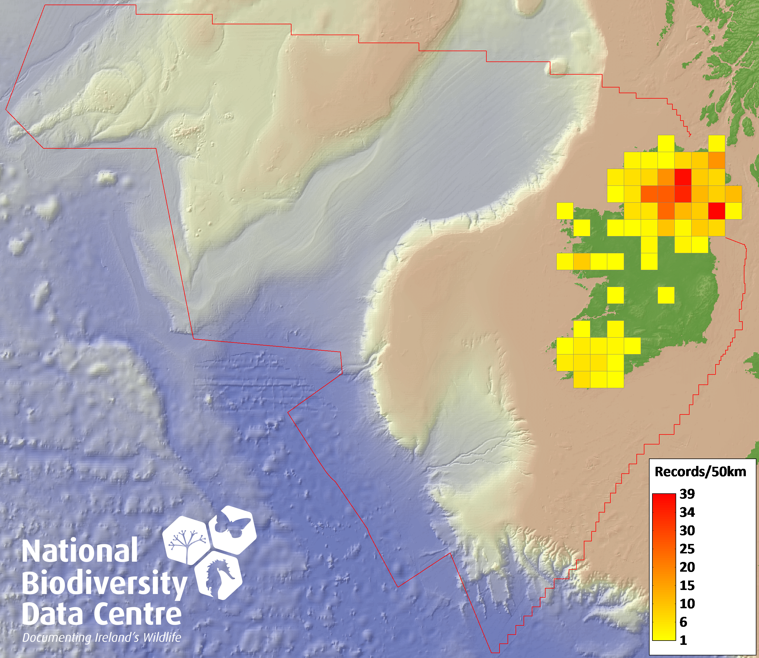 Distribution of the number of records recorded within each 10km grid square (ITM).Marine Map - 50km