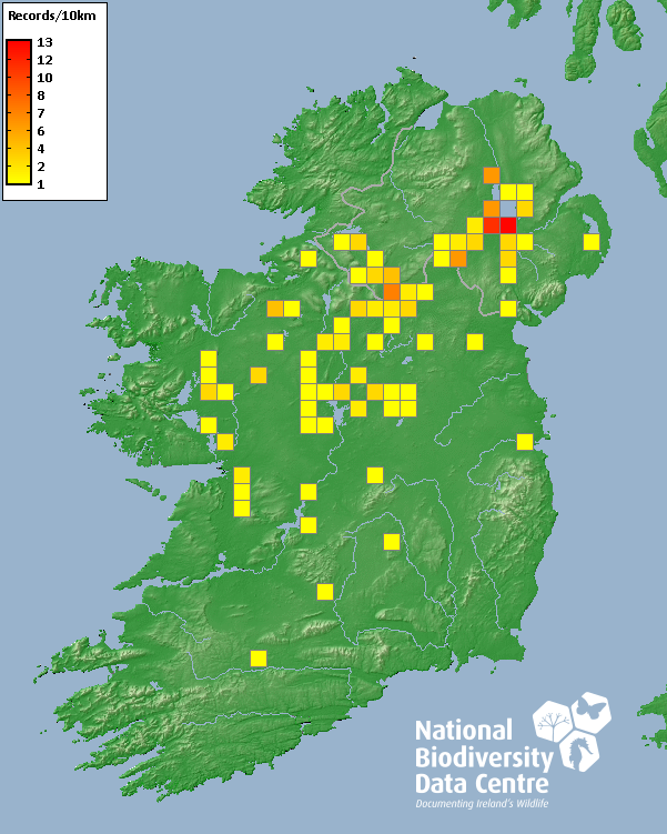 Distribution of the number of records recorded within each 10km grid square (ITM).Marine Map - 50km