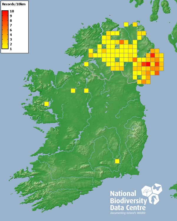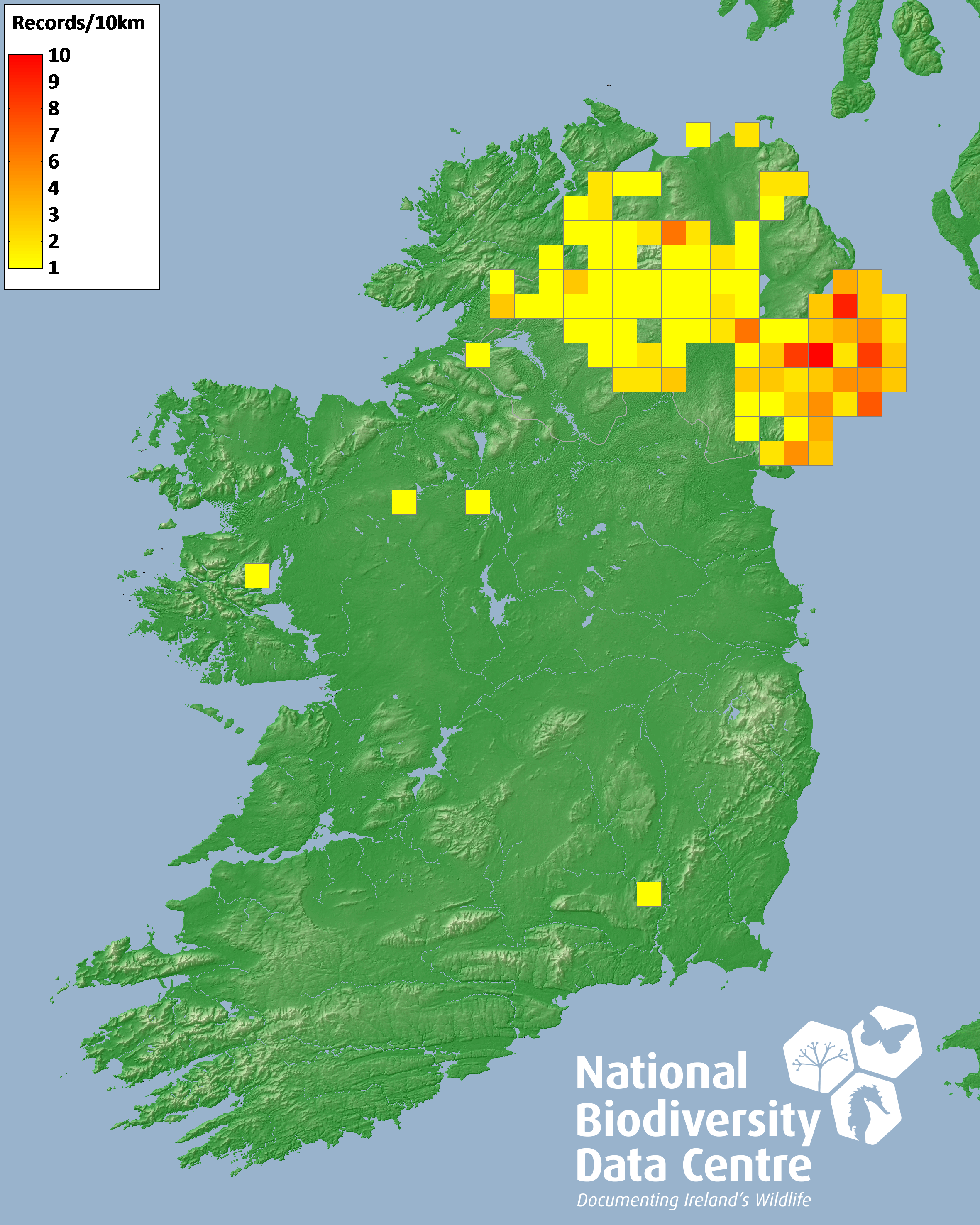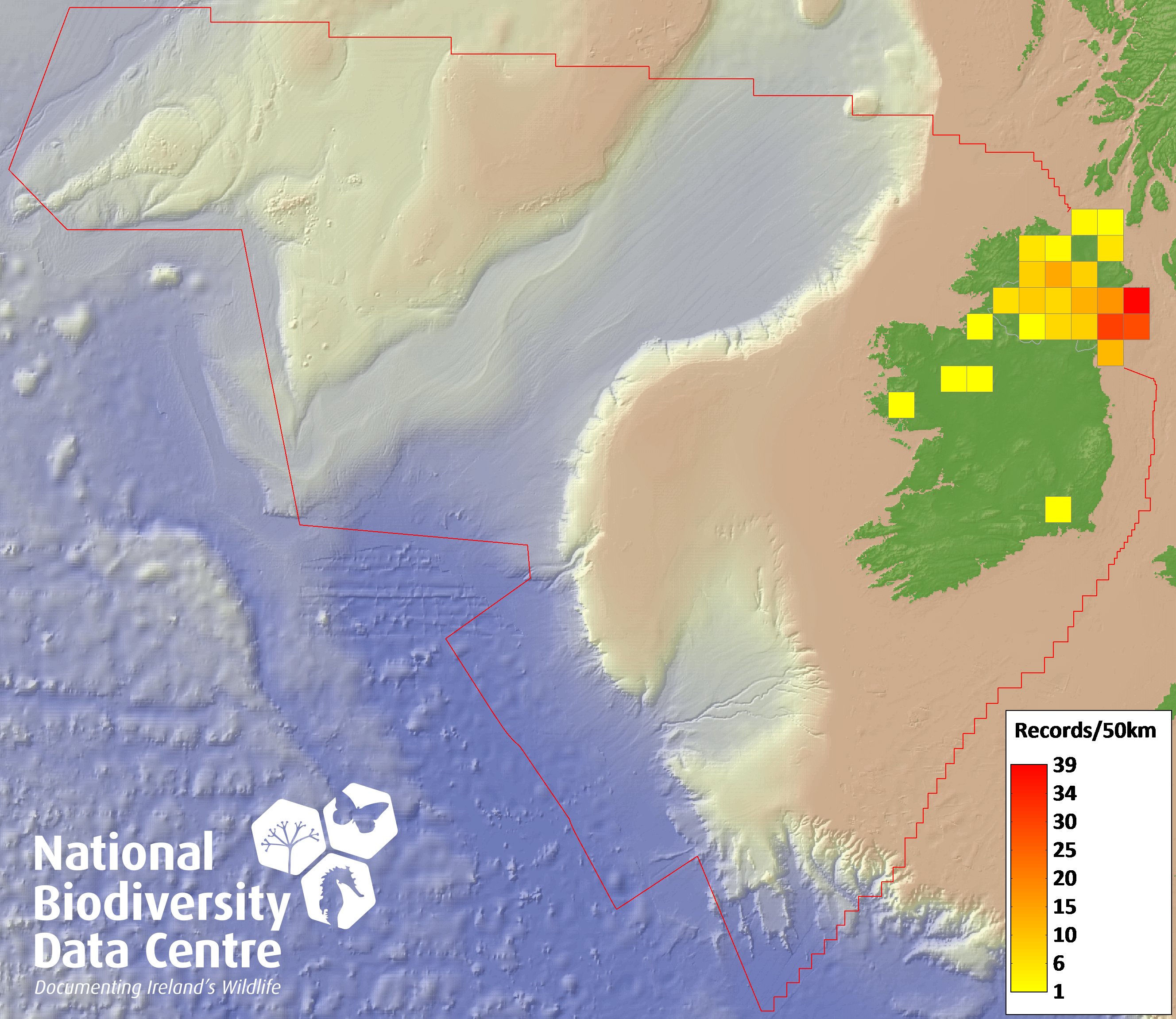 Distribution of the number of records recorded within each 10km grid square (ITM).Marine Map - 50km