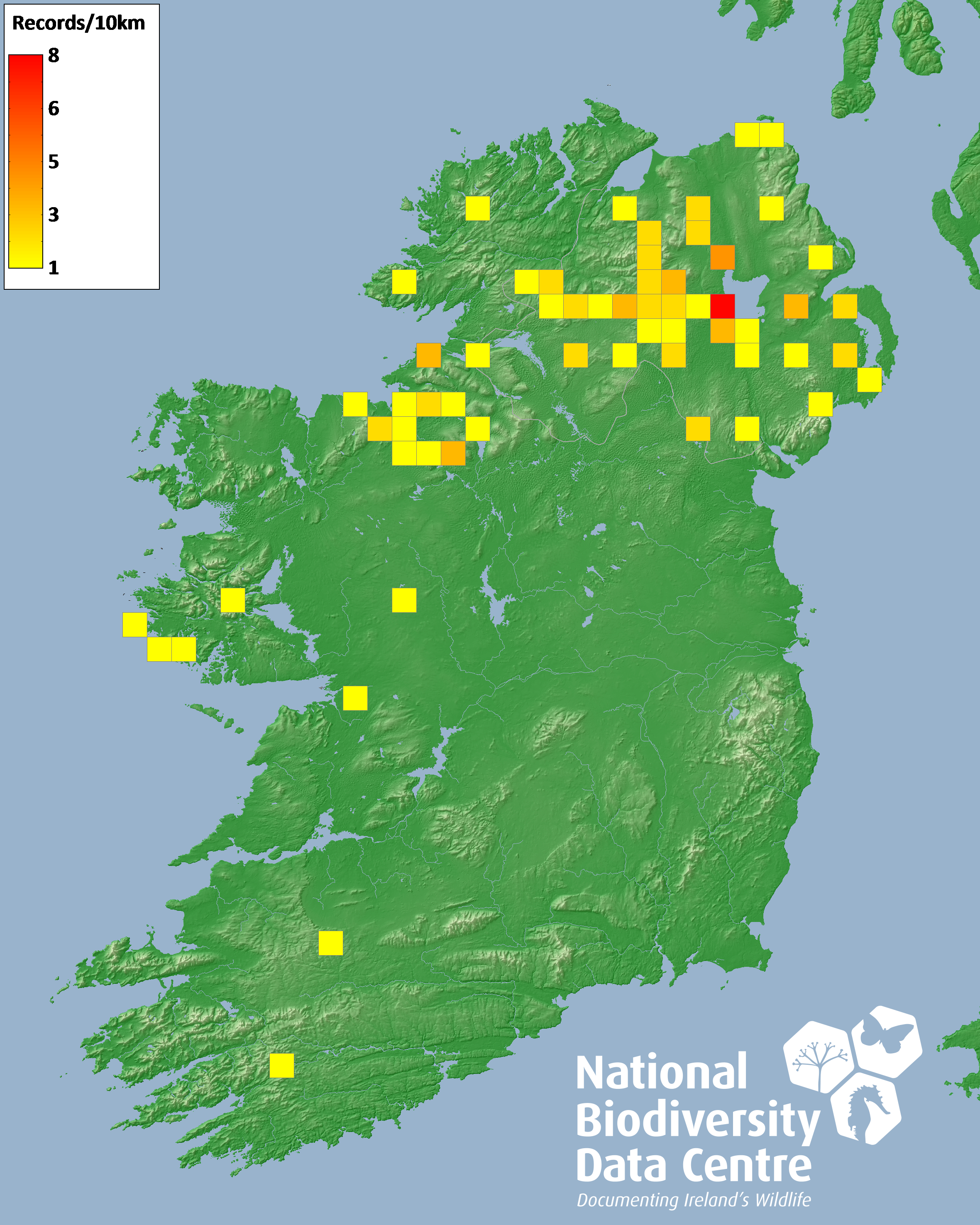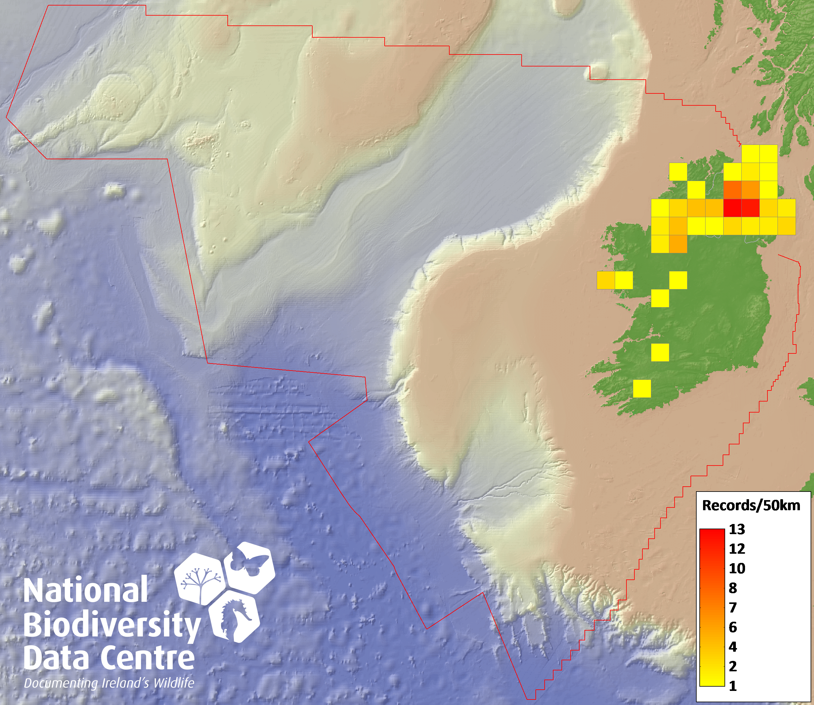 Distribution of the number of records recorded within each 10km grid square (ITM).Marine Map - 50km