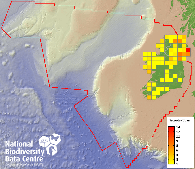 Distribution of the number of records recorded within each 10km grid square (ITM).Marine Map - 50km