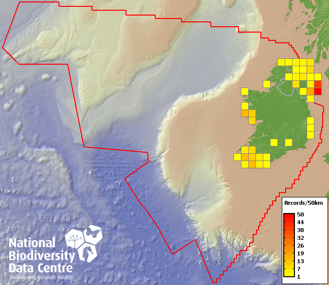 Distribution of the number of records recorded within each 10km grid square (ITM).Marine Map - 50km
