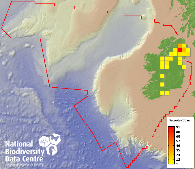 Distribution of the number of records recorded within each 10km grid square (ITM).Marine Map - 50km