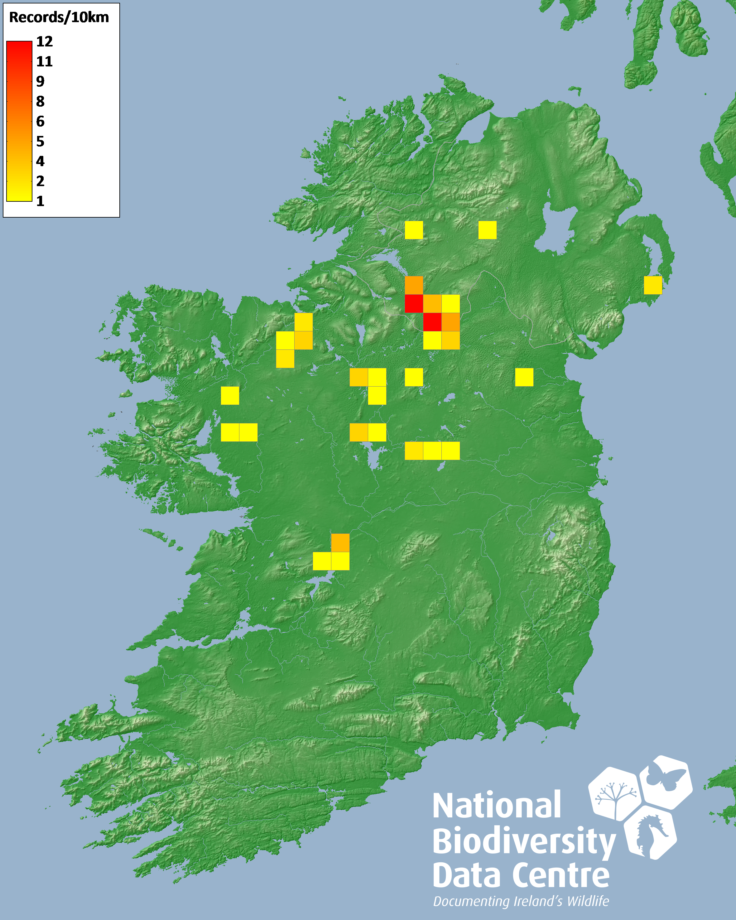 Distribution of the number of records recorded within each 10km grid square (ITM).Marine Map - 50km
