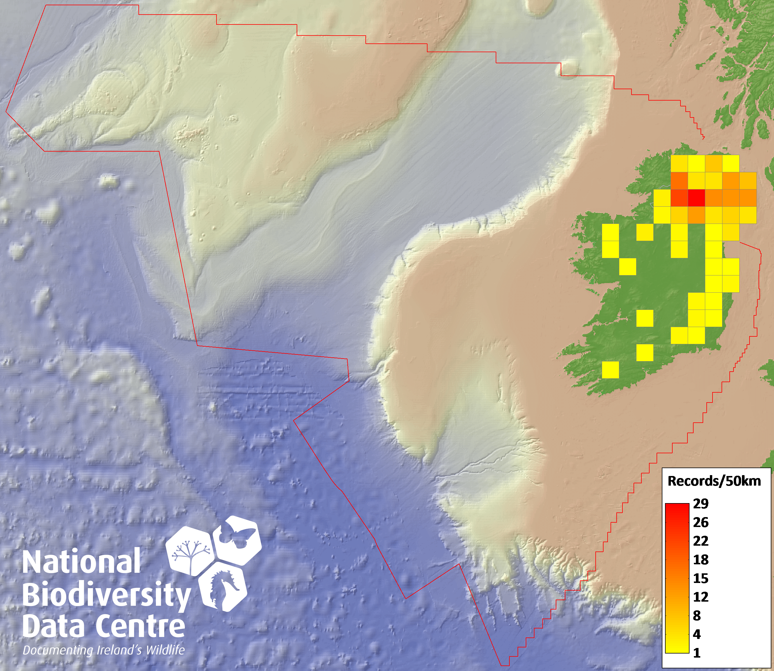 Distribution of the number of records recorded within each 10km grid square (ITM).Marine Map - 50km