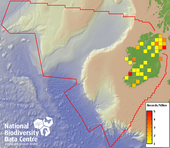 Distribution of the number of records recorded within each 10km grid square (ITM).Marine Map - 50km