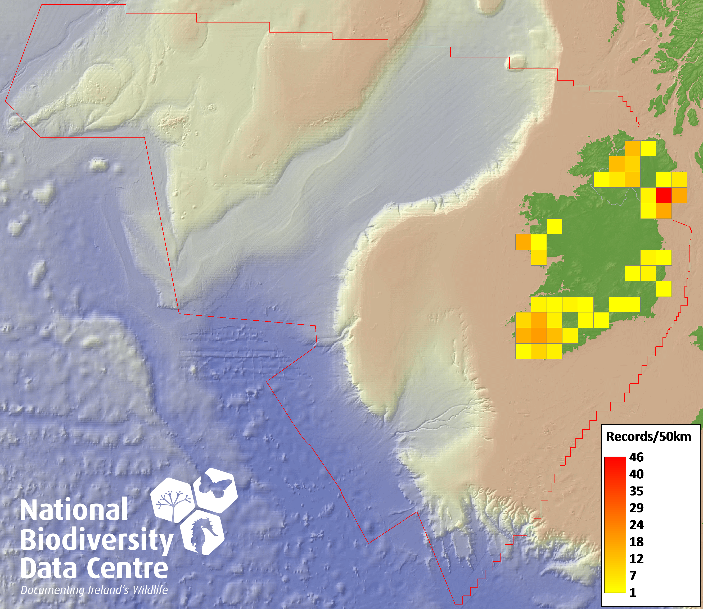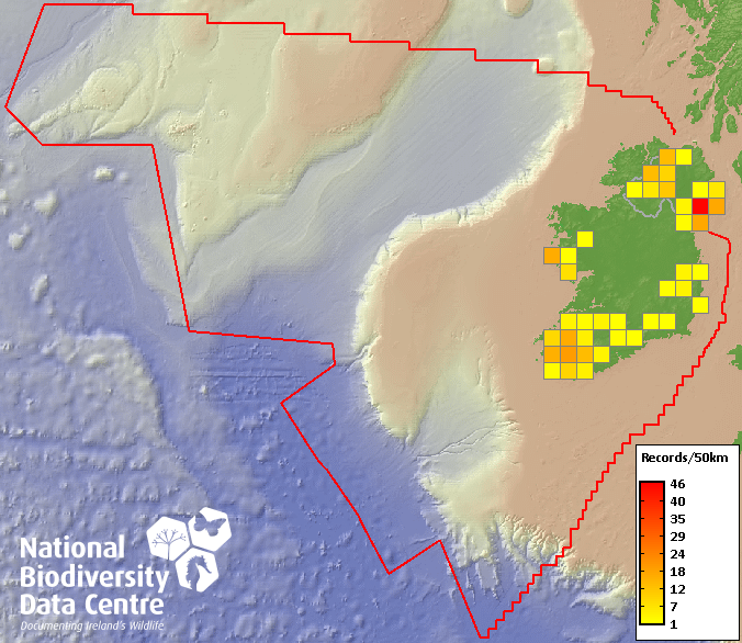 Distribution of the number of records recorded within each 10km grid square (ITM).Marine Map - 50km