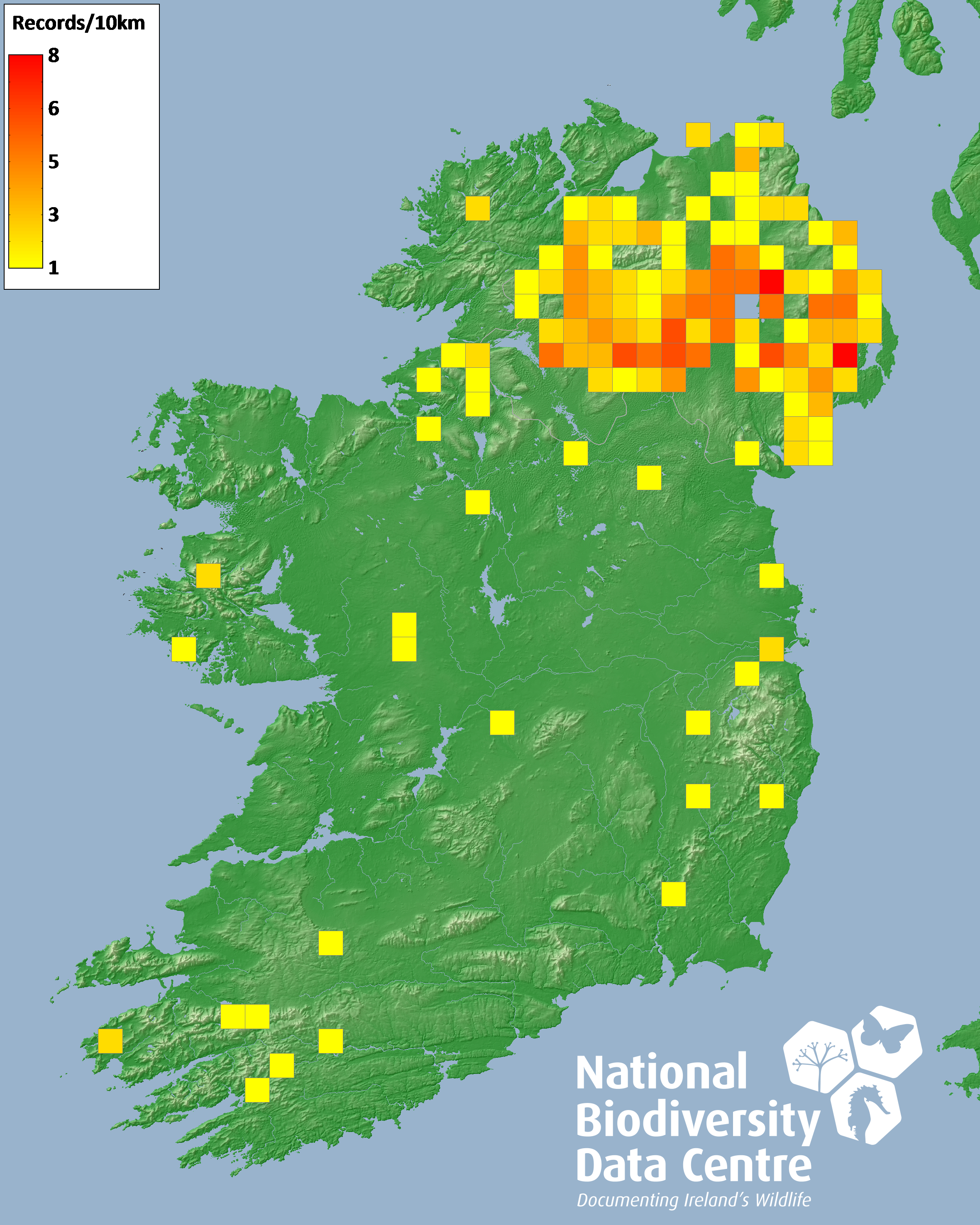 Distribution of the number of records recorded within each 10km grid square (ITM).Marine Map - 50km